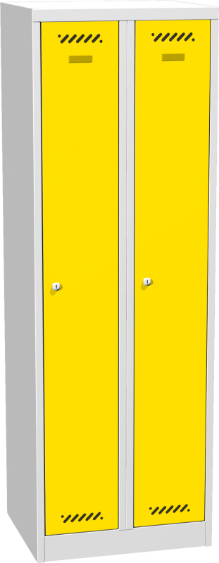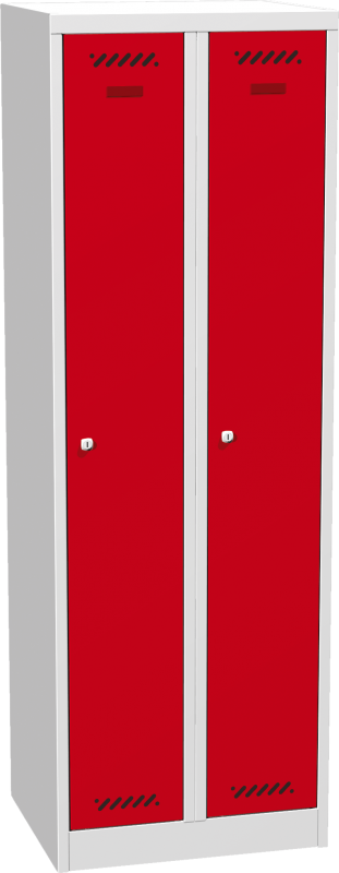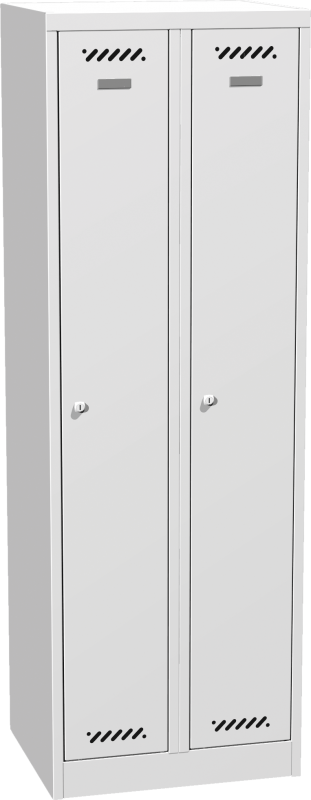 Dvojdverová kovová šatníková skriňa na sokli Šatníkové oddelenie je štandardne vybavené policou a tyčou na šaty s 3 plastovými háčikmi. mm zaručuje vysokú tuhosť a minimalizuje náročnosť na montáž. výstuhou pre zvýšenie odolnosti, vetracími otvormi pre účinné odvetranie a plastovým štítkom pre vloženie menovky. V korpuse sú zavesené na vnútorných čapoch. . Šatníková skriňa je štandardne vybavená cylindrickým zámkom s dvoma kľúčmi alebo otočným uzáverom pre visiaci zámok (visací zámok nie je súčasťou dodávky). Zamykanie dverí je jednobodové, umiestnené uprostred dverí. kombináciou a umožňuje dodanie hlavného kľúča. Dvere vybavené otočným uzáverom sú vystužené proti pretočeniu uzáveru vo dverách. Dvere šatníkovej skrine sú štandardne vybavené výstuhou pre zvýšenie odolnosti. triedy. Šatníkové oddelenie je možné za príplatok vybaviť plastovou podložkou pod obuv na zachytenie vody a nečistôt.
