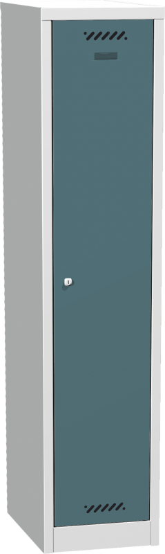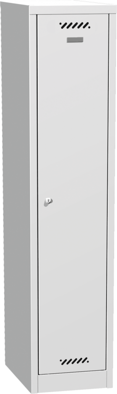 Jednodverová kovová šatníková skriňa na sokli Šatníkové oddelenie je štandardne vybavené policou a tyčou na šaty s 3 plastovými háčikmi. Za príplatok je možné ho vybaviť vnútornou medzistenou, ktorá zvisle rozdeľuje šatníkové oddelenie v priestore pod policou. Šatníkové oddelenie je štandardne vybavené policou a tyčou na šaty s 3 plastovými háčikmi. Za príplatok je možné ho vybaviť vnútornou medzistenou, ktorá zvisle rozdeľuje šatníkové oddelenie v priestore pod policou. Dvere sú štandardne vybavené výstuhou na zvýšenie odolnosti, vetracími otvormi na účinné odvetranie a plastovým štítkom na vloženie menovky. V korpuse sú zavesené na vnútorných čapoch. Za príplatok je možné dvere vybaviť inými typmi vetracích otvorov na dodanie aktraktívnejšieho vzhľadu, alebo dvere vymeniť za dvojplášťové, ktoré zvýšia bezpečnosť skrine. Šatníková skriňa je štandardne vybavená cylindrickým zámkom s dvoma kľúčmi alebo otočným uzáverom pre visiaci zámok (visací zámok nie je súčasťou dodávky). Zamykanie dverí je jednobodové, umiestnené uprostred dverí. Za príplatok je možné skriňu vybaviť viacbodovým zamykaním a iným typom zámku (mincovým alebo elektronickým). Cylindrický zámok má 2000 kombinácií a umožňuje dodanie hlavného kľúča. Dvere vybavené otočným uzáverom sú vystužené proti pretočeniu uzáveru vo dverách. Dvere šatníkovej skrine sú štandardne vybavené výstuhou pre zvýšenie odolnosti. Za príplatok je možné skriňu vybaviť viacbodovým uzamykacím mechanizmom, vymeniť jednoplášťové dvere za dvojplášťové, štandardný otočný uzáver vymeniť za otočný uzáver vyššej triedy. Šatňové oddelenie je možné za príplatok vybaviť plastovou podložkou pod obuv na zachytenie vody a nečistôt. Skriňu je možné doplniť súvisiacimi produktmi a tým veľmi zvýšiť jej úžitkové vlastnosti.