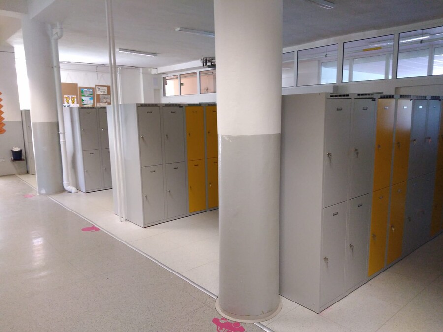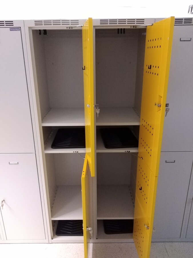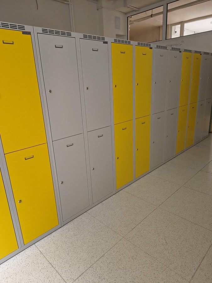 Pre školu sme vyrobili a inštalovali šatňové skrinky zo zosilneného oceľového plechu hrúbky 0,8 mm, ktoré sa vyznačujú vysokou odolnosťou a dlhou životnosťou. Skrinky sú vybavené dvoplášťovými dverami a horizontálnym delením, ktoré umožňuje maximálnu úsporu priestoru v šatniach pri zachovaní plnohodnotného komfortu pre každého používateľa.