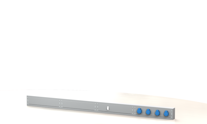 Energokanál. Energokanál EGK KOR 2000 2U vybavený panelom RCK 2U 4 ZZ sa 4 ks priemyselných vstavaných zásuviek na 230V, panelom RCK 2U 1JJ s jednofázovým ističom B 10A a 2 ks krytky RCK 2U KP.