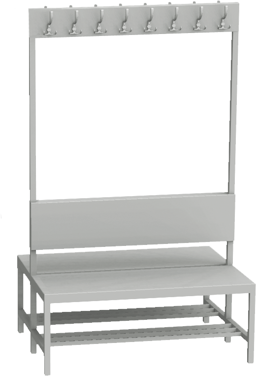 Obojstranná šatňová lavica s vešiakmi Jeklová masívna šatňová lavica s 2 x 8 vešiakmi, operadlom, roštom na topánky a sedákom. Lavica je určená pre vnútorné interiéry šatní škôl, priemyselných podnikov, zdravotníckych zariadení a pod.