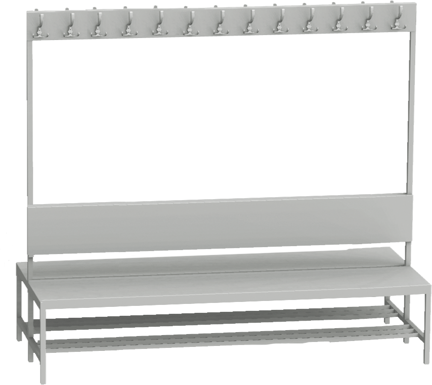 Obojstranná šatňová lavica s vešiakmi Jeklová masívna šatňová lavica s 2 x 13 vešiakmi, operadlom, roštom na topánky a sedákom. Lavica je určená pre vnútorné interiéry šatní škôl, priemyselných podnikov, zdravotníckych zariadení a pod.
