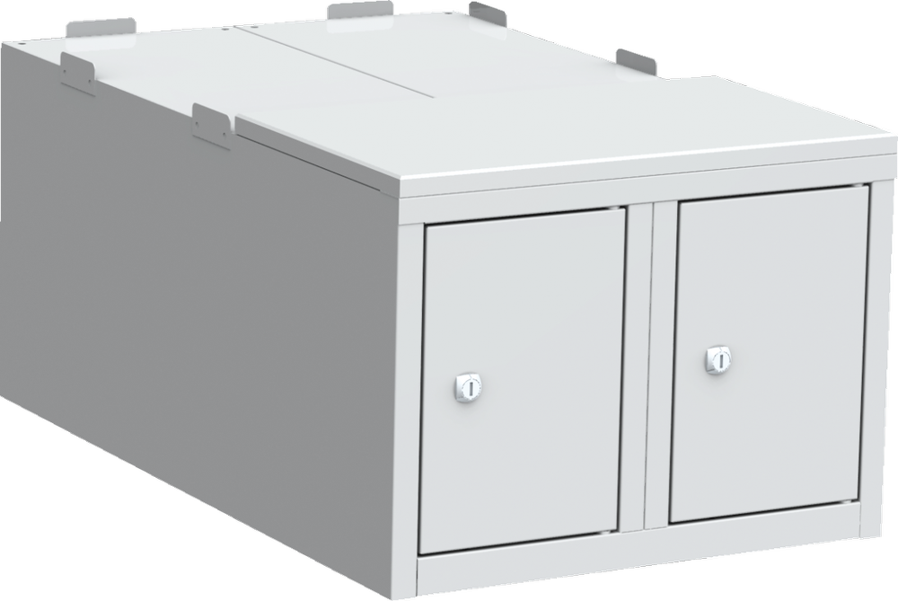 Podstavný box pod šatník Podstavný box určený na inštaláciu pod šatník šírky 800 mm, šatník musí mať znížený sokel výšky 35 mm (napr. rad SAL). Šatníková skriňa je usadená v zadnej časti, predná časť podstavného boxu je určená na sedenie. Box je vybavený dvoma uzamykateľnými schránkami. Dvere sú zavesené na vnútorných čapoch. Uzamykateľná schránka je štandardne vybavená cylindrickým zámkom s dvoma kľúčmi alebo otočným uzáverom pre visiaci zámok (visací zámok nie je súčasťou dodávky). Zamykanie dverí je jednobodové, umiestnené uprostred dverí. Za príplatok je možné skriňu vybaviť iným typom zámku (mincovým alebo elektronickým). Cylindrický zámok má 2000 kombinácií a umožňuje dodanie hlavného kľúča. Dvere šatníkovej skrine môžu byť za príplatok vybavené výstuhou cez celú dĺžku dverí pre zvýšenie odolnosti. Za príplatok je možné skriňu vybaviť viacbodovým uzamykacím mechanizmom, štandardný otočný uzáver vymeniť za otočný uzáver vyššej triedy. Šatníkové oddelenie je možné za príplatok vybaviť plastovou podložkou pod obuv na zachytenie vody a nečistôt.
