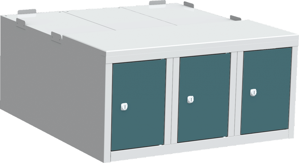 Podstavný box pod šatník Podstavný box určený na inštaláciu pod šatník šírky 750 mm, šatník musí mať znížený sokel výšky 35 mm (napr. rad SAL). Šatníková skriňa je usadená v zadnej časti, predná časť podstavného boxu je určená na sedenie. Box je vybavený dvoma uzamykateľnými schránkami. Dvere sú zavesené na vnútorných čapoch. Uzamykateľná schránka je štandardne vybavená cylindrickým zámkom s dvoma kľúčmi alebo otočným uzáverom pre visiaci zámok (visací zámok nie je súčasťou dodávky). Zamykanie dverí je jednobodové, umiestnené uprostred dverí. Za príplatok je možné skriňu vybaviť iným typom zámku (mincovým alebo elektronickým). Cylindrický zámok má 2000 kombinácií a umožňuje dodanie hlavného kľúča. Dvere šatníkovej skrine môžu byť za príplatok vybavené výstuhou cez celú dĺžku dverí pre zvýšenie odolnosti. Za príplatok je možné skriňu vybaviť viacbodovým uzamykacím mechanizmom, štandardný otočný uzáver vymeniť za otočný uzáver vyššej triedy. Šatníkové oddelenie je možné za príplatok vybaviť plastovou podložkou pod obuv na zachytenie vody a nečistôt.