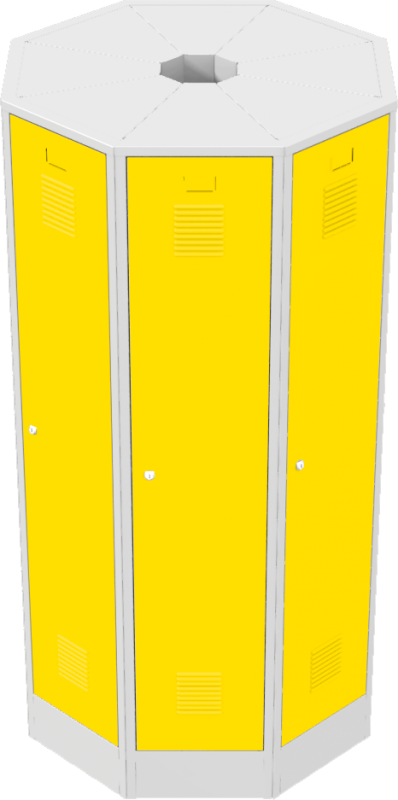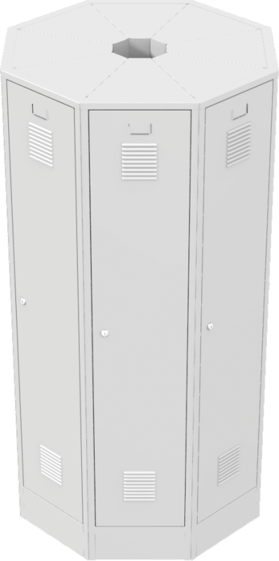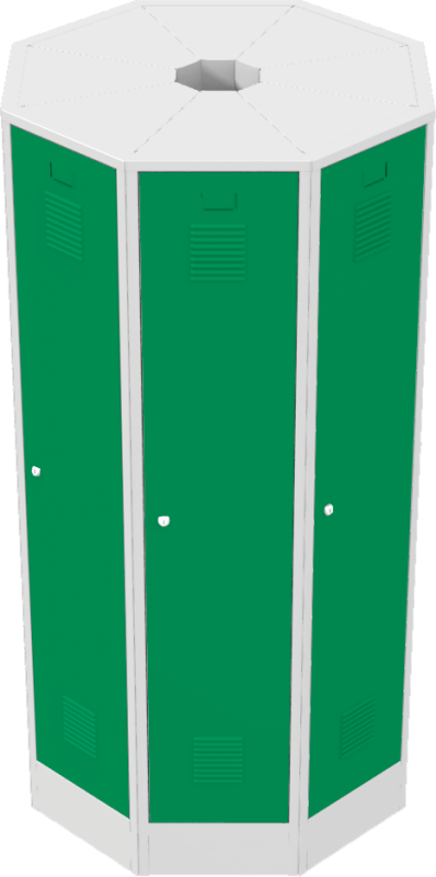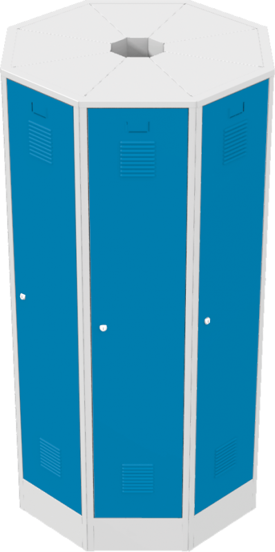 Voľne stojace hniezdo kovových šatníkových skríň Každé šatníkové oddelenie je štandardne vybavené policou a tyčou na šaty s 3 plastovými háčikmi. Každé šatníkové oddelenie je štandardne vybavené policou a tyčou na šaty s 3 plastovými háčikmi. Dvere sú štandardne vybavené výstuhou na zvýšenie odolnosti, vetracími žalúziami na účinné odvetranie a prelisom s papierovou menovkou. Dvere sú zavesené na vonkajších pántoch, na prianie zákazníka je možné zavesenie aj na vnútorné čapy. Za príplatok je možné dvere vybaviť inými typmi vetracích otvorov na dodanie aktraktívnejšieho vzhľadu. Pre zvýšenie bezpečnosti predĺžiť výstuhu cez celú dĺžku dverí alebo dvere vymeniť za dvojplášťové. Šatníkové skrine sú štandardne vybavené cylindrickým zámkom s dvoma kľúčmi alebo otočným uzáverom pre visiaci zámok (visací zámok nie je súčasťou dodávky). Zamykanie dverí je jednobodové, umiestnené uprostred dverí. Za príplatok je možné skriňu vybaviť viacbodovým zamykaním a iným typom zámku (mincovým alebo elektronickým). Cylindrický zámok má 2000 kombinácií a umožňuje dodanie hlavného kľúča. Dvere vybavené otočným uzáverom sú vystužené proti pretočeniu uzáveru vo dverách. Dvere šatníkovej skrine sú štandardne vybavené výstuhou pre zvýšenie odolnosti. Za príplatok je možné skriňu vybaviť viacbodovým uzamykacím mechanizmom, výstuhou cez celú dĺžku dverí, vymeniť jednoplášťové dvere za dvojplášťové, štandardný otočný uzáver vymeniť za otočný uzáver vyššej triedy.