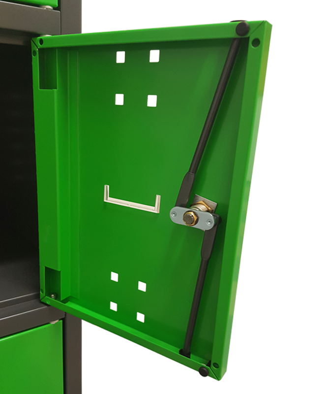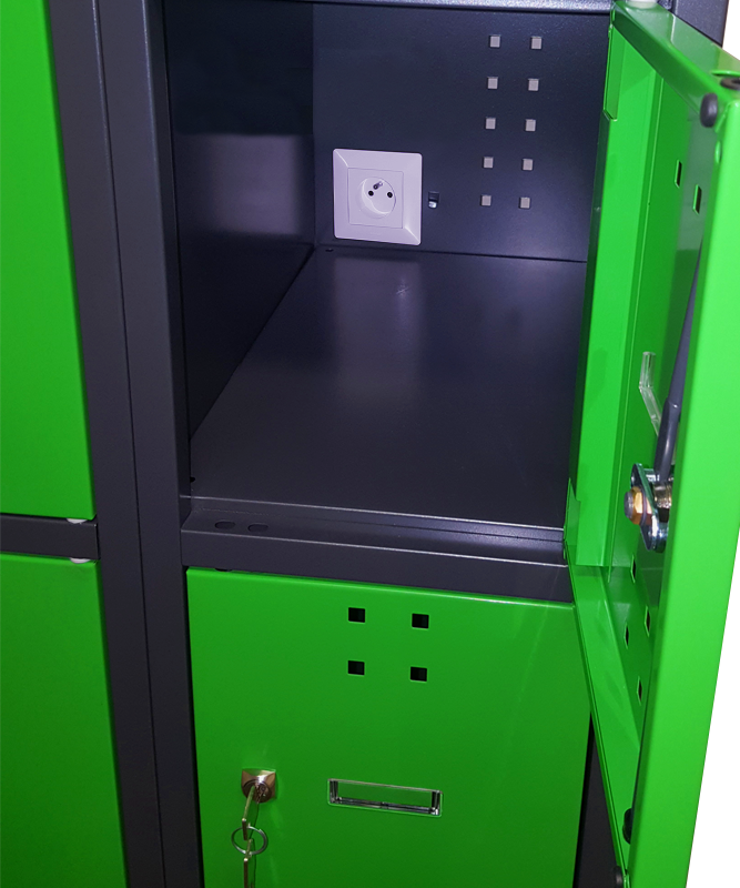 Skriňa na dobíjanie mobilných zariadení bez USB portov (mobil, tablet, notebook) Každý box je vybavený zásuvkou 230V. Rozmery vstupného otvoru sú 295 x 220mm (V x Š) - (uhlopriečka 350mm). Vnútorné rozmery boxu sú (V x Š x H) 328 x 295 x 470mm. Do jednotlivých oddelení je možné uložiť notebook až do rozmeru 17". Táto skriňa je ideálna pre nabíjanie notebookov, mobilov, tabletov, fotoaparátov či iných prenosných elektronických zariadení. Každý box má vlastnú zásuvku 230V. K vybaveniu skrine patrí samostatná uzamykateľná servisná časť. Obsahuje prúdový chránič s ističom 16A a prevádzkové kontrolné LED. inštalácia, zodpovedá požiadavkám noriem EU. Skriňa je dodávaná s odbornou revíznou správou. Je vhodná na umiestnenie v školách, na pracoviskách, v nákupných centrách, alebo v iných verejných priestoroch napr. konferenciách, firemných akciách či veľtrhoch. práškovou farbou RAL 6018. Po konzultácii s našimi pracovníkmi môžu byť lakované aj inými farebnými odtieňmi. Jednotlivé dvere obsahujú perforáciu pre odvetranie, uzavretý výstužný profil na strane čapu, dvoch bodový uzatvárací mechanizmus, zároveň sú vybavené plastovým štítkom. Štandardným uzatváracím systémom je dvojbodový rázvorový mechanizmus s cylindrickým zámkom (2 kľúče, 2000 kombinácií, možnosť key). Dvere je možné vybaviť aj mincovými alebo kódovými elektronickými zámkami.Technické parametre: