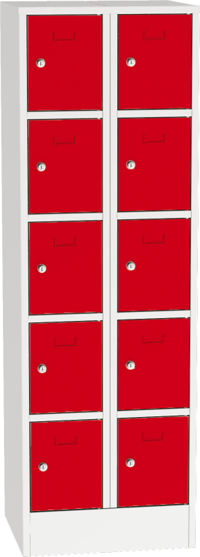 Kovová šatníková skriňa s uzamykateľnými schránkami Boxové skrine sú určené na úschovu osobných vecí, batohov, prezuvok a ďalších cenných predmetov. Pri súčasnom používaní šatníkovej skrine na oblečenie a uzamykateľnej schránky na osobné veci, odporúčame využiť možnosť odomykať ich rovnakým kľúčom. Dvere sú štandardne vybavené prelisom s papierovou menovkou, zavesené na vnútorných čapoch. Za príplatok je možné dvere vybaviť vetracími otvormi. Šatníková skriňa je štandardne vybavená cylindrickým zámkom s dvoma kľúčmi alebo otočným uzáverom pre visiaci zámok (visací zámok nie je súčasťou dodávky). Zamykanie dverí je jednobodové, umiestnené uprostred dverí. Za príplatok je možné skriňu vybaviť viacbodovým zamykaním a iným typom zámku (mincovým alebo elektronickým). Cylindrický zámok má 2000 kombinácií a umožňuje dodanie hlavného kľúča. Dvere vybavené otočným uzáverom sú vystužené proti pretočeniu uzáveru vo dverách. Za príplatok je možné skriňu vybaviť viacbodovým uzamykacím mechanizmom, štandardný otočný uzáver vymeniť za otočný uzáver vyššej triedy. Uzamykateľnú schránku je možné za príplatok vybaviť plastovou podložkou pod obuv na zachytenie vody a nečistôt. Šatníková skriňa je možné vybaviť šikmou strechou, tá zabraňuje odkladaniu odpadkov na strechu skrine a uľahčuje jej čistenie. Boxovú skriňu je možné doplniť súvisiacimi produktmi a tým veľmi zvýšiť jej úžitkové vlastnosti.