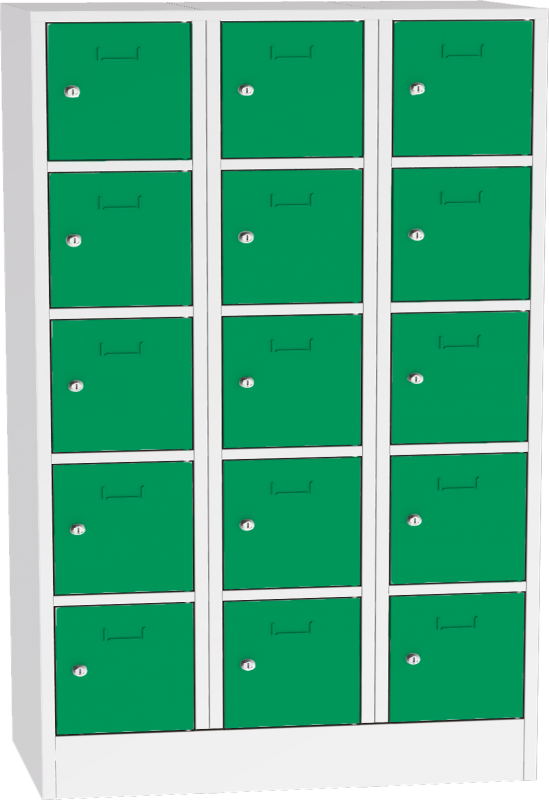 Kovová šatníková skriňa s uzamykateľnými schránkami Boxové skrine sú určené na úschovu osobných vecí, batohov, prezuvok a ďalších cenných predmetov. cez celú dĺžku dverí pre zvýšenie odolnosti a prelisom s papierovou menovkou. Dvere sú zavesené na vnútorných čapoch. Za príplatok je možné dvere vybaviť vetracími otvormi. je jednobodové, umiestnené uprostred dverí. Za príplatok je možné skriňu vybaviť viacbodovým zamykaním a iným typom zámku (mincovým alebo elektronickým). Cylindrický zámok má 2000 kombinácií a umožňuje dodanie hlavného kľúča. cez celú dĺžku dverí pre zvýšenie odolnosti Za príplatok je možné skriňu vybaviť viacbodovým uzamykacím mechanizmom, štandardný otočný uzáver vymeniť za otočný uzáver vyššej triedy. Uzamykateľnú schránku je možné za príplatok vybaviť plastovou podložkou pod obuv na zachytenie vody. tá zabraňuje odkladaniu odpadkov na strechu skrine a uľahčuje jej čistenie. Boxovú skriňu je možné doplniť súvisiacimi produktmi a tým veľmi zvýšiť jej úžitkové vlastnosti.