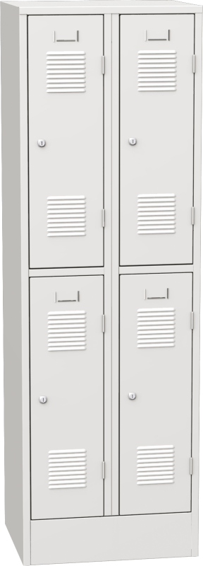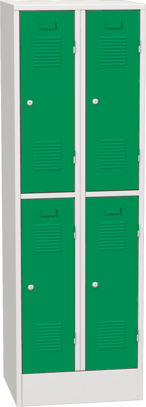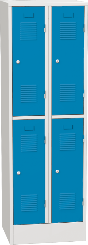 Horizontálne delená kovová šatníková skriňa Každé šatníkové oddelenie je štandardne vybavené tyčou na šaty s 3 plastovými háčikmi. Skrine sú určené tam, kde je požiadavka na umiestnenie vysokého počtu šatníkových oddelení v obmedzenom priestore. Rady SZS a SHS umožňujú umiestnenie dvojnásobného počtu šatníkových oddelení ako rady štandardné. Dvere sú štandardne vybavené výstuhou pre zvýšenie odolnosti, vetracími žalúziami pre účinné odvetranie a prelisom s papierovou menovkou. Dvere sú zavesené na vonkajších pántoch, na prianie zákazníka je možné zavesenie aj na vnútorné čapy. Za príplatok je možné dvere vybaviť inými typmi vetracích otvorov na dodanie aktraktívnejšieho vzhľadu. Pre zvýšenie bezpečnosti predĺžiť výstuhu cez celú dĺžku dverí, alebo dvere vymeniť za dvojplášťové. Šatníková skriňa je štandardne vybavená cylindrickým zámkom s dvoma kľúčmi alebo otočným uzáverom pre visiaci zámok (visací zámok nie je súčasťou dodávky). Zamykanie dverí je jednobodové, umiestnené uprostred dverí. Za príplatok je možné skriňu vybaviť viacbodovým zamykaním a iným typom zámku (mincovým alebo elektronickým). Cylindrický zámok má 2000 kombinácií a umožňuje dodanie hlavného kľúča. Dvere vybavené otočným uzáverom sú vystužené proti pretočeniu uzáveru vo dverách. Dvere šatníkovej skrine sú štandardne vybavené výstuhou pre zvýšenie odolnosti. Za príplatok je možné skriňu vybaviť viacbodovým uzamykacím mechanizmom, výstuhou cez celú dĺžku dverí, vymeniť jednoplášťové dvere za dvojplášťové, štandardný otočný uzáver vymeniť za otočný uzáver vyššej triedy. Šatňové oddelenie je možné za príplatok vybaviť plastovou podložkou. Šatníková skriňa je možné vybaviť šikmou strechou, tá zabraňuje odkladaniu odpadkov na strechu skrine a uľahčuje jej čistenie. Skriňu je možné doplniť súvisiacimi produktmi a tým veľmi zvýšiť jej úžitkové vlastnosti.