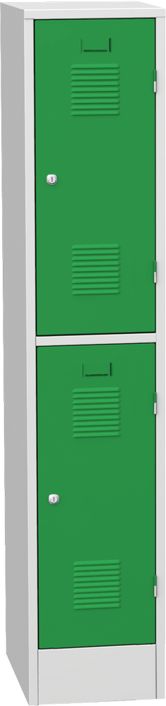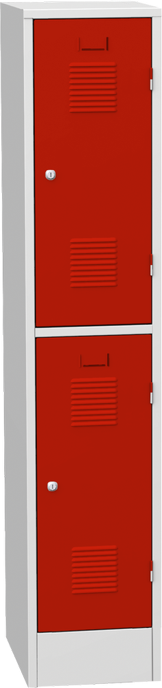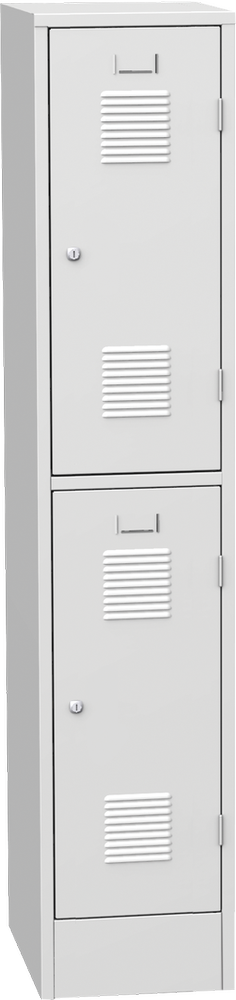 Horizontálne delená kovová šatníková skriňa Každé šatníkové oddelenie je štandardne vybavené tyčou na šaty s 3 plastovými háčikmi. Každé šatníkové oddelenie je štandardne vybavené tyčou na šaty s 3 plastovými háčikmi. Dvere sú štandardne vybavené výstuhou na zvýšenie odolnosti, vetracími žalúziami na účinné odvetranie a prelisom s papierovou menovkou. Dvere sú zavesené na vonkajších pántoch, na prianie zákazníka je možné zavesenie aj na vnútorné čapy. Za príplatok je možné dvere vybaviť inými typmi vetracích otvorov na dodanie aktraktívnejšieho vzhľadu. Pre zvýšenie bezpečnosti predĺžiť výstuhu cez celú dĺžku dverí alebo dvere vymeniť za dvojplášťové. Šatníková skriňa je štandardne vybavená cylindrickým zámkom s dvoma kľúčmi alebo otočným uzáverom pre visiaci zámok (visací zámok nie je súčasťou dodávky). Zamykanie dverí je jednobodové, umiestnené uprostred dverí. Za príplatok je možné skriňu vybaviť viacbodovým zamykaním a iným typom zámku (mincovým alebo elektronickým). Cylindrický zámok má 2000 kombinácií a umožňuje dodanie hlavného kľúča. Dvere vybavené otočným uzáverom sú vystužené proti pretočeniu uzáveru vo dverách. Dvere šatníkovej skrine sú štandardne vybavené výstuhou pre zvýšenie odolnosti. Za príplatok je možné skriňu vybaviť viacbodovým uzamykacím mechanizmom, výstuhou cez celú dĺžku dverí, vymeniť jednoplášťové dvere za dvojplášťové, štandardný otočný uzáver vymeniť za otočný uzáver vyššej triedy. Šatňové oddelenie je možné za príplatok vybaviť plastovou podložkou pod obuv na zachytenie vody a nečistôt. Šatníková skriňa je možné vybaviť šikmou strechou, tá zabraňuje odkladaniu odpadkov na strechu skrine a uľahčuje jej čistenie. Skriňu je možné doplniť súvisiacimi produktmi a tým veľmi zvýšiť jej úžitkové vlastnosti.