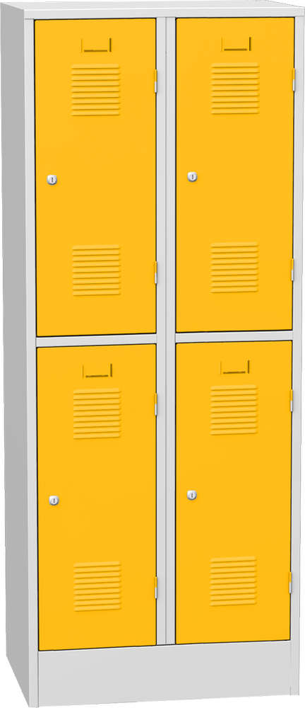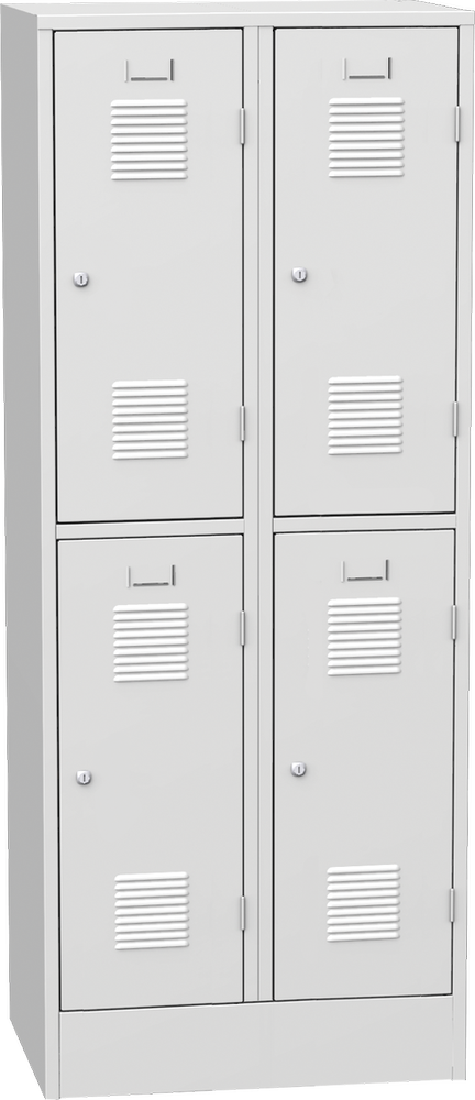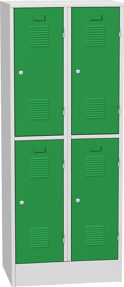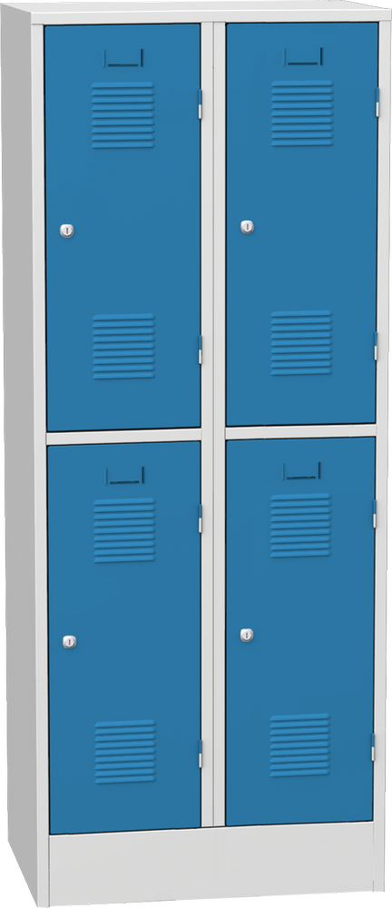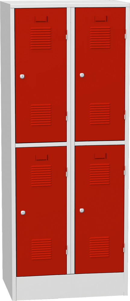 Horizontálne delená kovová šatníková skriňa Každé šatníkové oddelenie je štandardne vybavené tyčou na šaty s 3 plastovými háčikmi. Každé šatníkové oddelenie je štandardne vybavené tyčou na šaty s 3 plastovými háčikmi. Dvere sú štandardne vybavené výstuhou na zvýšenie odolnosti, vetracími žalúziami na účinné odvetranie a prelisom s papierovou menovkou. Dvere sú zavesené na vonkajších pántoch, na prianie zákazníka je možné zavesenie aj na vnútorné čapy. Za príplatok je možné dvere vybaviť inými typmi vetracích otvorov na dodanie aktraktívnejšieho vzhľadu. Pre zvýšenie bezpečnosti predĺžiť výstuhu cez celú dĺžku dverí alebo dvere vymeniť za dvojplášťové. Šatníková skriňa je štandardne vybavená cylindrickým zámkom s dvoma kľúčmi alebo otočným uzáverom pre visiaci zámok (visací zámok nie je súčasťou dodávky). Zamykanie dverí je jednobodové, umiestnené uprostred dverí. Za príplatok je možné skriňu vybaviť viacbodovým zamykaním a iným typom zámku (mincovým alebo elektronickým). Cylindrický zámok má 2000 kombinácií a umožňuje dodanie hlavného kľúča. Dvere vybavené otočným uzáverom sú vystužené proti pretočeniu uzáveru vo dverách. Dvere šatníkovej skrine sú štandardne vybavené výstuhou pre zvýšenie odolnosti. Za príplatok je možné skriňu vybaviť viacbodovým uzamykacím mechanizmom, výstuhou cez celú dĺžku dverí, vymeniť jednoplášťové dvere za dvojplášťové, štandardný otočný uzáver vymeniť za otočný uzáver vyššej triedy. Šatňové oddelenie je možné za príplatok vybaviť plastovou podložkou pod obuv na zachytenie vody a nečistôt. Šatníková skriňa je možné vybaviť šikmou strechou, tá zabraňuje odkladaniu odpadkov na strechu skrine a uľahčuje jej čistenie. Skriňu je možné doplniť súvisiacimi produktmi a tým veľmi zvýšiť jej úžitkové vlastnosti.