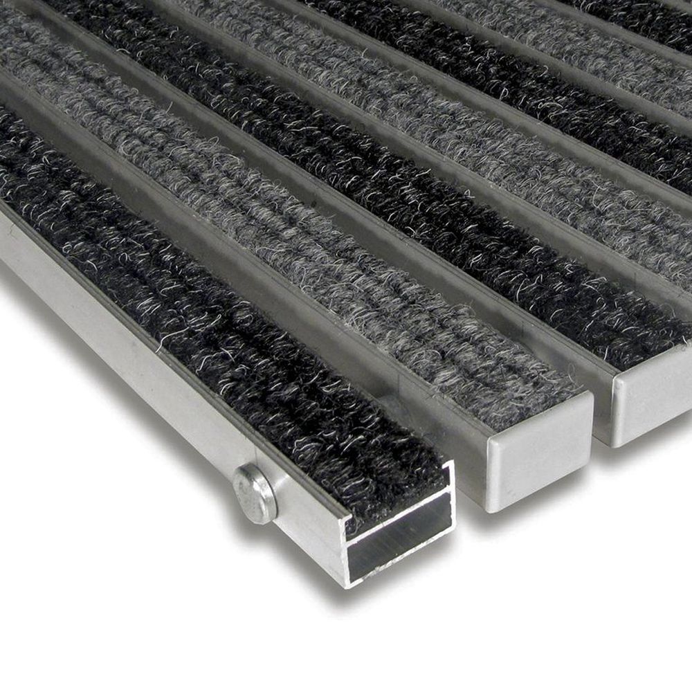 Textilná hliníková vstupná rohož Alu Standard - dĺžka 100 cm, šírka 100 cm, výška 2,2 cm Základom rohože Alu Standard sú hliníkové profily o šírke 27 mm, ktoré sú spojené nerezovým lankom a oddelené gumovými medzikrúžkami, tým je umožnené stáčanie rohože a jednoduchšie. pri upratovaní. Do hliníkových profilov sa fixujú gumové alebo textilné pásky, ktoré je možné ľubovoľne kombinovať a po opotrebení vymeniť. Najčastejšie použitie vstupnej čistiacej zóny vstupné priestory hotelov, bánk, reštaurácií, administratívnych budov únikové východy Varianty Nasledujúce varianty výplní hliníkových profilov je možné ľubovoľne kombinovať. Všetky dostupné varianty materiálu aj farieb je možné nájsť vo fotogalérii. guma (palička): používa sa ako 1. čistiaca zóna na odstránenie hrubej nečistoty (kamienky, bahno, atp.) textil: používa sa ako 2. čistiaca zóna na odstránenie jemných nečistôt (voda, prach) Textilný variant je možné zakúpiť v nasledujúcich farbách : čierna, šedá, svetlo modrá, tmavo modrá, žltá, eben, tmavo hnedá, zelená, morská zelená a červená. Technický popis variant: textilná (čierna, šedá) dĺžka: 100 cm - dĺžka plochy, ktorá čistí obuv v smere chôdze šírka: 100 cm - dĺžka prúžkov, niekedy tiež šírka dverí výška: 2,2 cm hmotnosť: 14 kg zaťaženie: do 7 t / 100 cm? Montáž / inštalácia Rohož je možné v úrovni podlahy uložiť do pripraveného otvoru osadeným hliníkovým / nerezovým rámom šírky 25, výšky 25 a hrúbky 3 mm. Rohož je taktiež možné voľne položiť spolu s nábehovým rámom širokým 65 mm, popr. 45 mm pre rohože do max. dĺžky 120 cm.