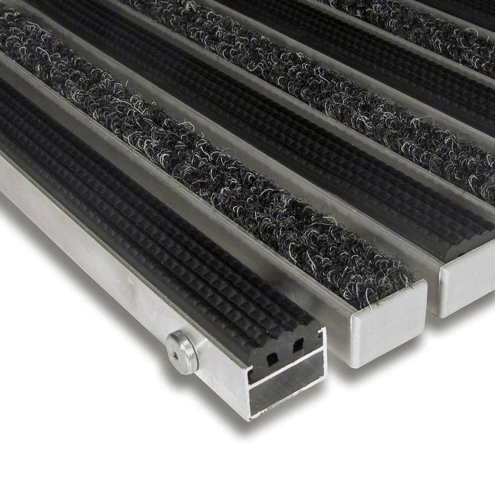 Textilná gumová hliníková vstupná rohož Alu Standard - dĺžka 100 cm, šírka 100 cm, výška 2,2 cm Základom rohože Alu Standard sú hliníkové profily o šírke 27 mm, ktoré sú spojené nerezovým lankom a oddelené gumovými medzikrúžkami, tým je umožnené stáčanie rohože a jednoduchšie manipuláciu pri upratovaní. Do hliníkových profilov sa fixujú gumové alebo textilné pásky, ktoré je možné ľubovoľne kombinovať a po opotrebení vymeniť. Najčastejšie použitie vstupnej čistiacej zóny vstupné priestory hotelov, bánk, reštaurácií, administratívnych budov únikové východy Varianty Nasledujúce varianty výplní hliníkových profilov je možné ľubovoľne kombinovať. Všetky dostupné varianty materiálu aj farieb je možné nájsť vo fotogalérii. guma (palička): používa sa ako 1. čistiaca zóna na odstránenie hrubej nečistoty (kamienky, bahno, atp.) textil: používa sa ako 2. čistiaca zóna na odstránenie jemných nečistôt (voda, prach) Textilný variant je možné zakúpiť v nasledujúcich farbách : čierna, šedá, svetlo modrá, tmavo modrá, žltá, eben, tmavo hnedá, zelená, morská zelená a červená. Technický popis variant: kombinácia guma (palička) + textilná (čierna) dĺžka: 100 cm - dĺžka plochy, ktorá čistí obuv v smere chôdze šírka: 100 cm - dĺžka prúžkov, niekedy tiež šírka dverí výška: 2,2 cm hmotnosť: 16 kg zaťaženie: do 7 t / 100 cm? Montáž / inštalácia Rohož je možné v úrovni podlahy uložiť do pripraveného otvoru osadeným hliníkovým / nerezovým rámom šírky 25, výšky 25 a hrúbky 3 mm. Rohož je taktiež možné voľne položiť spolu s nábehovým rámom širokým 65 mm, popr. 45 mm pre rohože do max. dĺžky 120 cm.