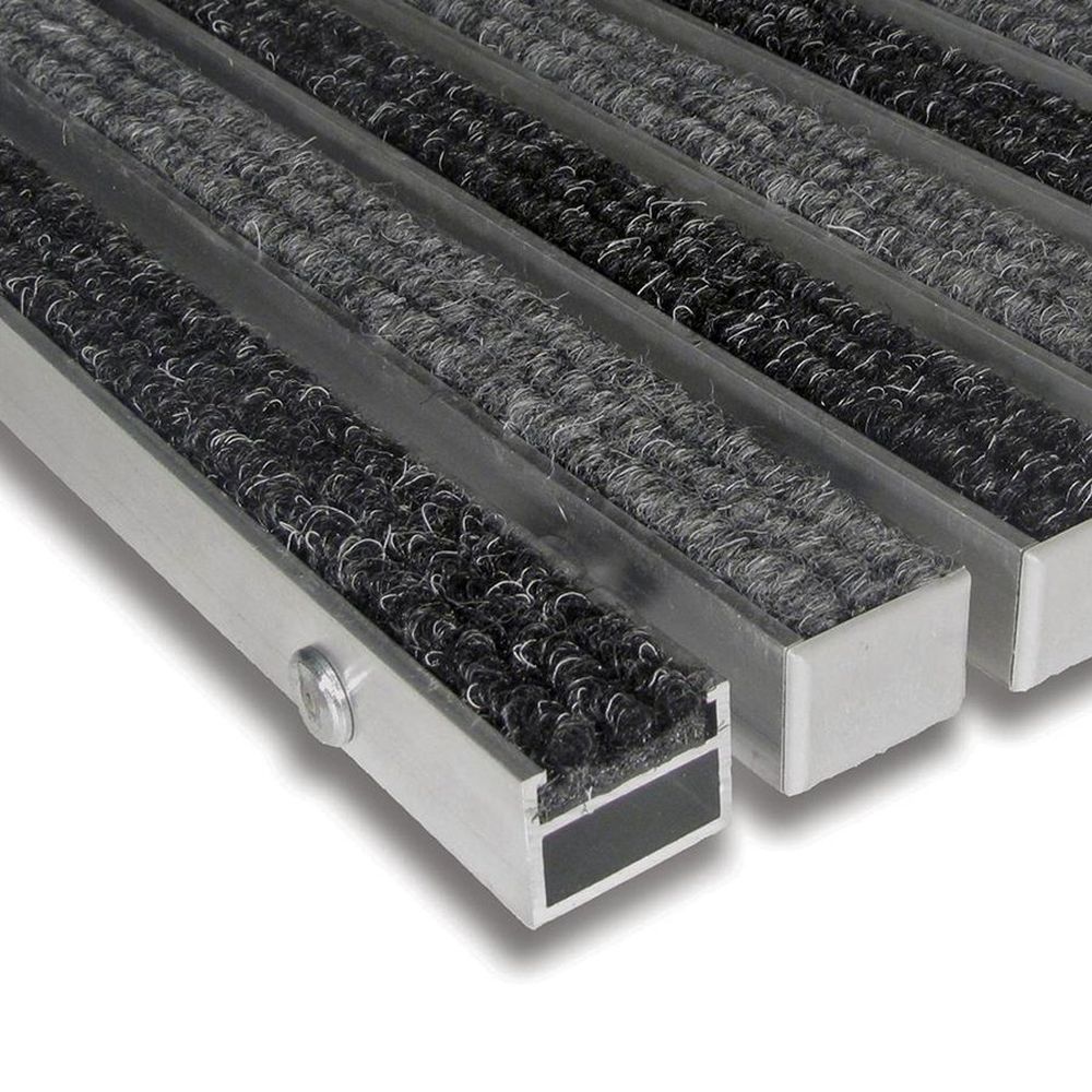 Textilná hliníková vstupná rohož Alu Standard - dĺžka 100 cm, šírka 100 cm, výška 2,7 cm Základom rohože Alu Standard sú hliníkové profily o šírke 27 mm, ktoré sú spojené nerezovým lankom a oddelené gumovými medzikrúžkami, tým je umožnené stáčanie rohože a jednoduchšie. pri upratovaní. Do hliníkových profilov sa fixujú gumové alebo textilné pásky, ktoré je možné ľubovoľne kombinovať a po opotrebení vymeniť. Najčastejšie použitie vstupnej čistiacej zóny vstupné priestory hotelov, bánk, reštaurácií, administratívnych budov únikové východy Varianty Nasledujúce varianty výplní hliníkových profilov je možné ľubovoľne kombinovať. Všetky dostupné varianty materiálu aj farieb je možné nájsť vo fotogalérii. guma (palička): používa sa ako 1. čistiaca zóna na odstránenie hrubej nečistoty (kamienky, bahno, atp.) textil: používa sa ako 2. čistiaca zóna na odstránenie jemných nečistôt (voda, prach) Textilný variant je možné zakúpiť v nasledujúcich farbách : čierna, šedá, svetlo modrá, tmavo modrá, žltá, eben, tmavo hnedá, zelená, morská zelená a červená. Technický popis variant: textilná (čierna, šedá) dĺžka: 100 cm - dĺžka plochy, ktorá čistí obuv v smere chôdze šírka: 100 cm - dĺžka prúžkov, niekedy tiež šírka dverí výška: 2,7 cm hmotnosť: 18 kg zaťaženie: do 8 ,5 t / 100 cm? Montáž / inštalácia Rohož je možné v úrovni podlahy uložiť do pripraveného otvoru osadeným hliníkovým / nerezovým rámom šírky 30, výšky 30 a hrúbky 3 mm. Rohož je taktiež možné voľne položiť spolu s nábehovým rámom širokým 65 mm, popr. 45 mm pre rohože do max. dĺžky 120 cm.