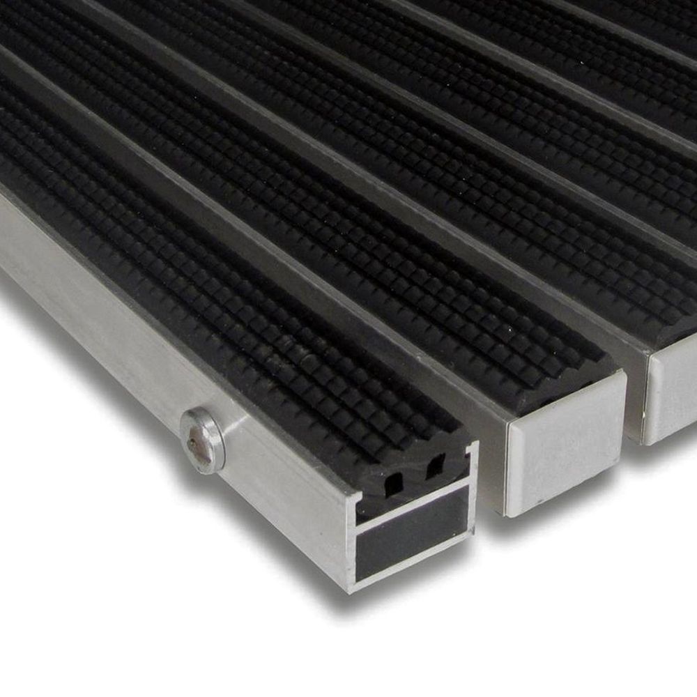 Gumová hliníková vonkajšia vstupná rohož Alu Standard - dĺžka 80 cm, šírka 120 cm, výška 2,7 cm Základom rohože Alu Standard sú hliníkové profily o šírke 27 mm, ktoré sú spojené nerezovým lankom a oddelené gumovými medzikrúžkami, tým je umožnené stáčanie rohože a jednoduchšie manipuláciu pri upratovaní. Do hliníkových profilov sa fixujú gumové alebo textilné pásky, ktoré je možné ľubovoľne kombinovať a po opotrebení vymeniť. Najčastejšie použitie vstupnej čistiacej zóny vstupné priestory hotelov, bánk, reštaurácií, administratívnych budov únikové východy Varianty Nasledujúce varianty výplní hliníkových profilov je možné ľubovoľne kombinovať. Všetky dostupné varianty materiálu aj farieb je možné nájsť vo fotogalérii. guma (palička): používa sa ako 1. čistiaca zóna na odstránenie hrubej nečistoty (kamienky, bahno, atp.) textil: používa sa ako 2. čistiaca zóna na odstránenie jemných nečistôt (voda, prach) Textilný variant je možné zakúpiť v nasledujúcich farbách : čierna, šedá, svetlo modrá, tmavo modrá, žltá, eben, tmavo hnedá, zelená, morská zelená a červená. Technický popis variant: guma (palička) dĺžka: 800 mm - dĺžka plochy, ktorá čistí obuv v smere chôdze šírka: 1200 mm - dĺžka prúžkov, niekedy tiež šírka dverí výška: 27 mm hmotnosť: 17,3 kg zaťaženie: do 8,5 t / 100 cm? Montáž / inštalácia Rohož je možné v úrovni podlahy uložiť do pripraveného otvoru osadeným hliníkovým / nerezovým rámom šírky 30, výšky 30 a hrúbky 3 mm. Rohož je taktiež možné voľne položiť spolu s nábehovým rámom širokým 65 mm, popr. 45 mm pre rohože do max. dĺžky 120 cm.