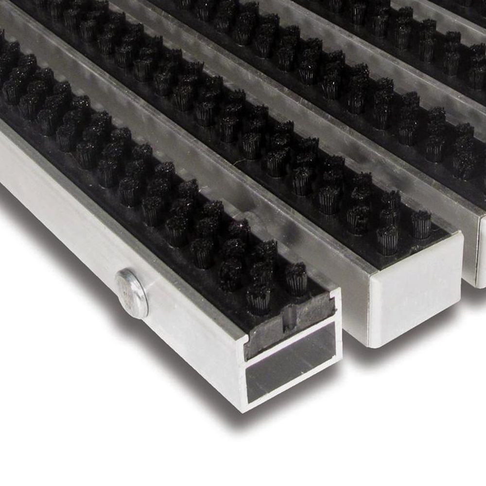 Čierna hliníková kefová vonkajšia vstupná rohož Alu Super - dĺžka 80 cm, šírka 120 cm, výška 2,7 cm Základom rohože Alu Super sú hliníkové profily o šírke 27 mm, ktoré sú spojené nerezovým lankom a oddelené gumovými medzikrúžkami, tým je umožnené stáčanie rohože a jednoduchšiu manipuláciu pri upratovaní. Do hliníkových profilov sa pevne fixujú kefové pásky, ktoré sa používajú ako čistiaca zóna na odstránenie hrubých nečistôt. Kefové pásky je možné ľubovoľne kombinovať a po opotrebení vymeniť. Najčastejšie použitie vstupnej čistiacej zóny vstupné priestory letísk, hotelov, bánk, reštaurácií, administratívnych budov i rodinných domov Vlastnosti vynikajúce očistenie obuvi od nečistôt pred vstupom do objektov jednoduchá údržba Technický popis dĺžka: 800 mm - dĺžka plochy, ktorá čistí obuv v smere chôdze šírka: 1200 mm - dĺžka prúžkov, niekedy tiež šírka dverí výška: 27 mm hmotnosť: 17,3 kg zaťaženie: do 8,5 t / 100 cm? farba: čierna Montáž / inštalácia Rohož je možné v úrovni podlahy uložiť do pripraveného otvoru osadeného hliníkovým / nerezovým rámom šírky 30, výšky 30 a hrúbky 3 mm. Rohož je taktiež možné voľne položiť spolu s nábehovým rámom širokým 65 mm, popr. 45 mm pre rohože do max. dĺžky 120 cm.