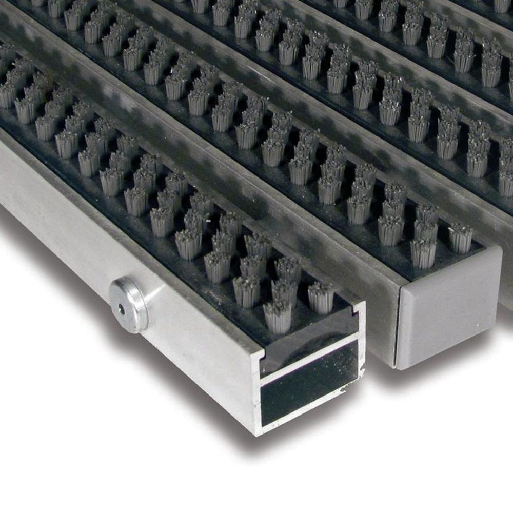 Šedá hliníková kefová vonkajšia vstupná rohož Alu Super - dĺžka 100 cm, šírka 150 cm, výška 2,7 cm Základom rohože Alu Super sú hliníkové profily o šírke 27 mm, ktoré sú spojené nerezovým lankom a oddelené gumovými medzikrúžkami, tým je umožnené stáčanie rohože a jednoduchšiu manipuláciu pri upratovaní. Do hliníkových profilov sa pevne fixujú kefové pásky, ktoré sa používajú ako čistiaca zóna na odstránenie hrubých nečistôt. Kefové pásky je možné ľubovoľne kombinovať a po opotrebení vymeniť. Najčastejšie použitie vstupnej čistiacej zóny vstupné priestory letísk, hotelov, bánk, reštaurácií, administratívnych budov i rodinných domov Vlastnosti vynikajúce očistenie obuvi od nečistôt pred vstupom do objektov jednoduchá údržba Technický popis dĺžka: 1000 mm - dĺžka plochy, ktorá čistí obuv v smere chôdze šírka: 1500 mm - dĺžka prúžkov, niekedy tiež šírka dverí výška: 27 mm hmotnosť: 27 kg zaťaženie: do 8,5 t / 100 cm? farba: šedá Montáž / inštalácia Rohož je možné v úrovni podlahy uložiť do pripraveného otvoru osadeného hliníkovým / nerezovým rámom šírky 30, výšky 30 a hrúbky 3 mm. Rohož je taktiež možné voľne položiť spolu s nábehovým rámom širokým 65 mm, popr. 45 mm pre rohože do max. dĺžky 120 cm.