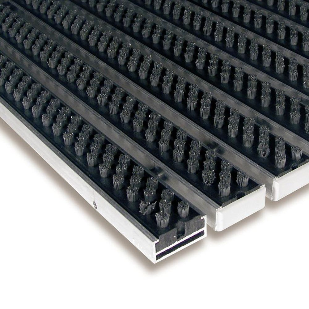 Šedá hliníková kefová vonkajšia vstupná rohož Alu Super - dĺžka 60 cm, šírka 90 cm, výška 1,7 cm Základom rohože Alu Super sú hliníkové profily o šírke 27 mm, ktoré sú spojené nerezovým lankom a oddelené gumovými medzikrúžkami, tým je umožnené stáčanie rohože a jednoduchšiu manipuláciu pri upratovaní. Do hliníkových profilov sa pevne fixujú kefové pásky, ktoré sa používajú ako čistiaca zóna na odstránenie hrubých nečistôt. Kefové pásky je možné ľubovoľne kombinovať a po opotrebení vymeniť. Najčastejšie použitie vstupnej čistiacej zóny vstupné priestory letísk, hotelov, bánk, reštaurácií, administratívnych budov i rodinných domov Vlastnosti vynikajúce očistenie obuvi od nečistôt pred vstupom do objektov jednoduchá údržba Technický popis dĺžka: 600 mm - dĺžka plochy, ktorá čistí obuv v smere chôdze šírka: 900 mm - dĺžka prúžkov, niekedy tiež šírka dverí výška: 17 mm hmotnosť: 8,1 kg zaťaženie: do 5,5 t / 100 cm? farba: šedá Montáž / inštalácia Rohož je možné v úrovni podlahy uložiť do pripraveného otvoru osadeného hliníkovým / nerezovým rámom šírky 20, výšky 20 a hrúbky 3 mm. Rohož je taktiež možné voľne položiť spolu s nábehovým rámom širokým 65 mm.