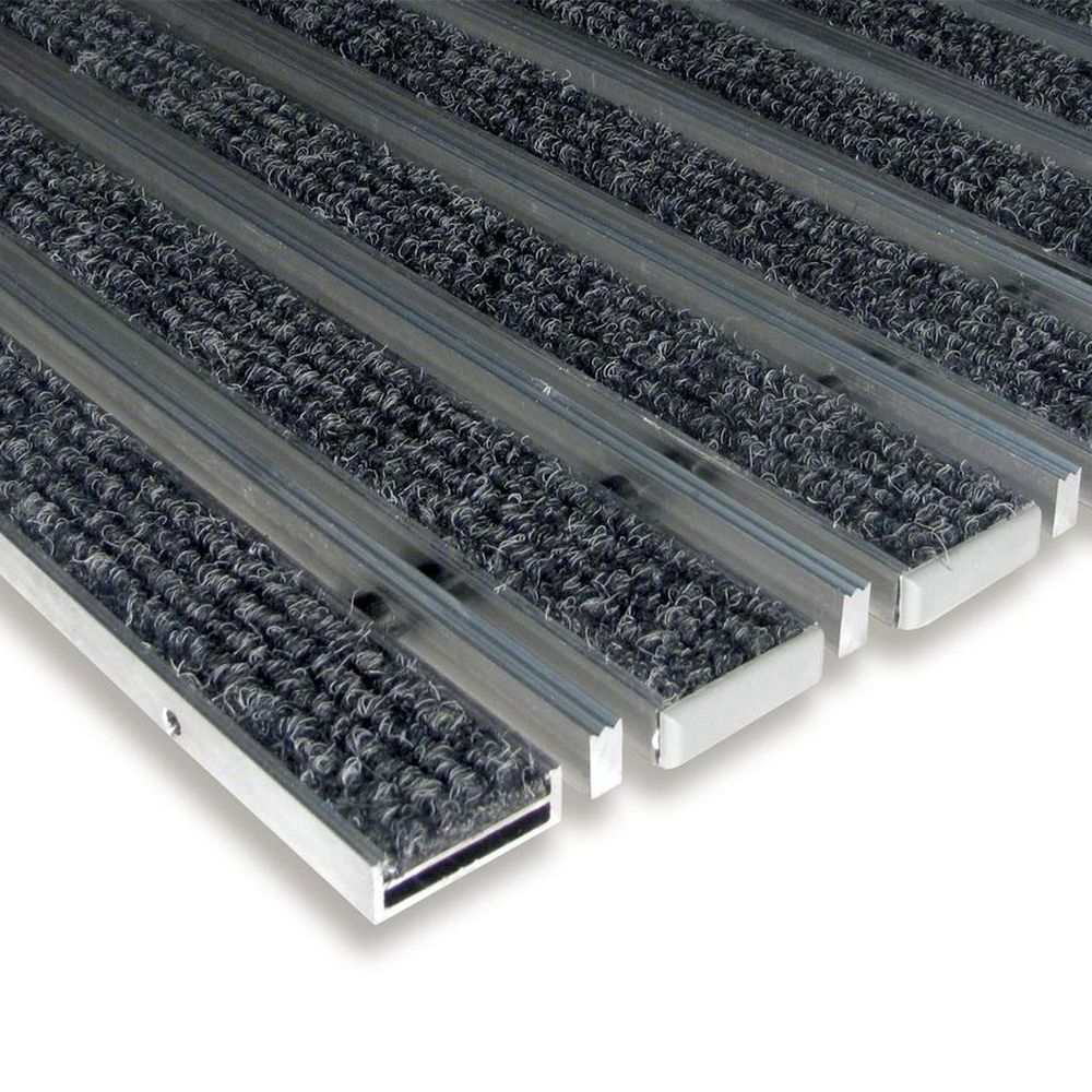 Textilná hliníková kefová vstupná rohož Alu Low Extra - dĺžka 60 cm, šírka 90 cm, výška 1 cm Základom rohože Alu Low Extra sú hliníkové profily o šírke 27 mm, ktoré sú spojené nerezovým lankom a oddelené gumovými medzikrúžkami, tým je umožnené stáčanie rohože manipuláciu pri upratovaní. Do hliníkových profilov sa pevne fixujú textilné pásky, ktoré sa používajú ako čistiaca zóna na odstránenie hrubých nečistôt. Pásky je možné ľubovoľne kombinovať a po opotrebení vymeniť. budov aj rodinných domov Vlastnosti vynikajúce očistenie obuvi od nečistôt pred vstupom do objektov jednoduchá údržba rohož nie je vhodná do karuselových dverí Technický popis dĺžka: 600 mm - dĺžka plochy, ktorá čistí obuv v smere chôdze šírka: 900 mm - dĺžka prúžkov, niekedy tiež šírka dverí výška: 10 mm zaťaženie: do 2,5 t / 100 cm? hmotnosť: 6 kg farba textilnej pásky: čierna / šedá / hnedá / striedajúce sa farby (nutné špecifikovať v poznámke pri objednávke) Montáž / inštalácia Rohož je možné v úrovni podlahy uložiť do pripraveného otvoru osadeného hliníkovým / nerezovým rámom šírky 30, výšky 13 a hrúbky 3 mm Rohož je taktiež možné voľne položiť spolu s nábehovým rámom širokým 45 mm