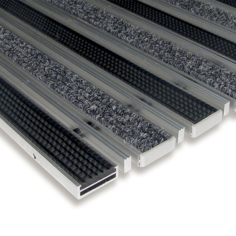 Textilná gumová hliníková kefová vstupná rohož Alu Low Extra - dĺžka 60 cm, šírka 90 cm, výška 1 cm Základom rohože Alu Low Extra sú hliníkové profily o šírke 27 mm, ktoré sú spojené nerezovým lankom a oddelené gumovými medzikrúžkami, tým je umožnené stáčanie rohože jednoduchšiu manipuláciu pri upratovaní. Do hliníkových profilov sa pevne fixujú gumové a textilné pásky, ktoré sa používajú ako čistiaca zóna na odstránenie hrubých nečistôt. Pásky je možné ľubovoľne kombinovať a po opotrebení vymeniť. Medzi hliníkové profily je navyše vložená hliníková škrabka. Najčastejšie použitie vstupnej čistiacej zóny vstupné priestory letísk, hotelov, bánk, reštaurácií, administratívnych budov i rodinných domov Vlastnosti vynikajúce očistenie obuvi od nečistôt pred vstupom do objektov jednoduchá údržba rohož nie je vhodná do karuselových dverí Technický popis dĺžka: 600 mm - dĺžka plochy, ktorá čistí obuv v smere chôdze šírka: 900 mm - dĺžka prúžkov, niekedy tiež šírka dverí výška: 10 mm zaťaženie: do 2,5 t / 100 cm? hmotnosť: 6 kg farba textilnej pásky: čierna / šedá / hnedá / striedajúce sa farby (nutné špecifikovať v poznámke u objednávky) gumová páska: paličky Montáž / inštalácia Rohož je možné v úrovni podlahy uložiť do pripraveného otvoru osadeného hliníkovým / nerezovým rámom šírky 30, výšky 13 a hrúbky 3 mm Rohož je taktiež možné voľne položiť spolu s nábehovým rámom širokým 45 mm