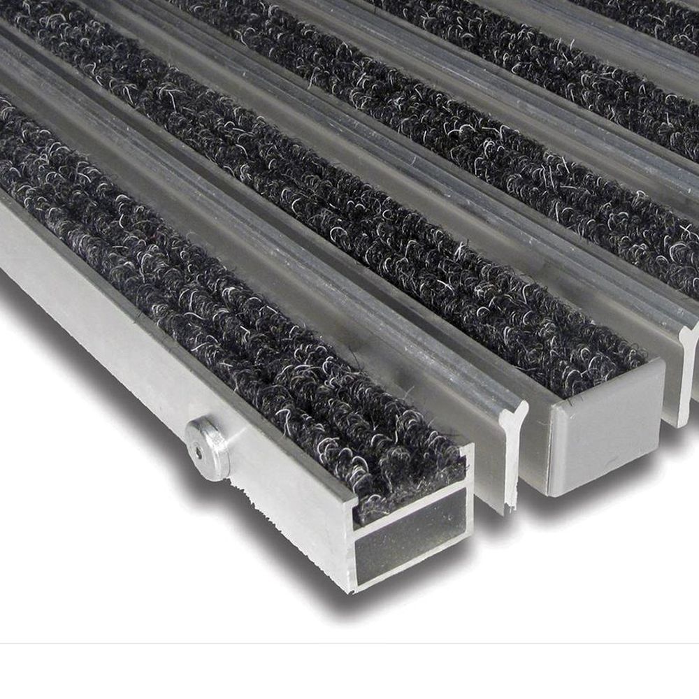 Textilná hliníková kefová vstupná rohož Alu Extra - dĺžka 100 cm, šírka 150 cm, výška 2,7 cm Základom rohože Alu Extra sú hliníkové profily so šírkou 27 mm, ktoré sú spojené nerezovým lankom a oddelené gumovými medzikrúžkami, tým je umožnené stáčanie rohože manipuláciu pri upratovaní. Do hliníkových profilov sa fixujú gumové alebo textilné pásky, ktoré je možné ľubovoľne kombinovať a po opotrebení vymeniť. Medzi hliníkové profily je navyše možné vložiť hliníkovú škrabku v tvare „Y“ alebo kefový profil. Najčastejšie použitie vstupnej čistiacej zóny vstupné priestory letísk, hotelov, bánk, reštaurácií, administratívnych budov únikové východy Varianty Nasledujúce varianty je možné ľubovoľne kombinovať. Všetky dostupné varianty materiálu aj farieb je možné nájsť vo fotogalérii. hliníková škrabka (samostatný kus): používa sa ako 1. čistiaca zóna na odstránenie hrubej nečistoty (kamienky, bahno, atp.) kefový profil (samostatný kus): použitie ako hliníková škrabka guma (výplň alu profilu): používa sa na rovnaké účely ako škrabka kefový pásik (výplň alu profilu): používa sa na rovnaké účely ako škrabka textil (výplň alu profilu): používa sa ako 2. čistiaca zóna na odstránenie jemných nečistôt (voda, prach) Kefkový pásik je možné zakúpiť v čiernej, bielej a hnedej farbe, viď fotogaléria. Textilnú alu výplň je možné zakúpiť v nasledujúcich farbách: čierna, šedá, svetlo modrá, tmavo modrá, žltá, eben, tmavo hnedá, zelená, morská zelená a červená. Technický popis variant: kombinácia textílií (čierna) + hliníková škrabka dĺžka: 1000 mm - dĺžka plochy, ktorá čistí obuv v smere chôdze šírka: 1500 mm - dĺžka prúžkov, niekedy tiež šírka dverí výška: 27 mm hmotnosť: 15 až 17 kg / m? (podľa prevedenia) zaťaženie: do 8,5 t / 100 cm? Montáž / inštalácia Rohož je možné v úrovni podlahy uložiť do pripraveného otvoru osadeného hliníkovým / nerezovým rámom šírky 30, výšky 30 a hrúbky 3 mm. Rohož je taktiež možné voľne položiť spolu s nábehovým rámom širokým 65 mm, popr. 45 mm pre rohože do max. dĺžky 120 cm.