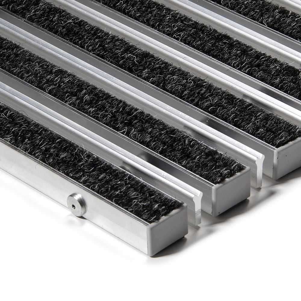 Textilná hliníková kefová vstupná rohož Alu Extra - dĺžka 60 cm, šírka 90 cm, výška 2,2 cm Základom rohože Alu Extra sú hliníkové profily o šírke 27 mm, ktoré sú spojené nerezovým lankom a oddelené gumovými medzikrúžkami, tým je umožnené stáčanie rohože a jednoduchšie. manipuláciu pri upratovaní. Do hliníkových profilov sa fixujú gumové alebo textilné pásky, ktoré je možné ľubovoľne kombinovať a po opotrebení vymeniť. Medzi hliníkové profily je navyše možné vložiť hliníkovú škrabku. Najčastejšie použitie vstupnej čistiacej zóny vstupné priestory hotelov, bánk, reštaurácií, administratívnych budov únikové východy Varianty Nasledujúce varianty je možné ľubovoľne kombinovať. Všetky dostupné varianty materiálu aj farieb je možné nájsť vo fotogalérii. hliníková škrabka (samostatný kus): používa sa ako 1. čistiaca zóna na odstránenie hrubej nečistoty (kamienky, bahno, atp.) guma (výplň alu profilu): používa sa na rovnaké účely ako škrabka kefový pásik (výplň alu profilu): používa sa na rovnaké účely ako škrabka textil (výplň alu profilu): používa sa ako 2. čistiaca zóna na odstránenie jemných nečistôt (voda, prach) Kefkový pásik je možné zakúpiť v čiernej, bielej a hnedej farbe, viď fotogaléria. Textilnú alu výplň je možné zakúpiť v nasledujúcich farbách: čierna, šedá, svetlo modrá, tmavo modrá, žltá, eben, tmavo hnedá, zelená, morská zelená a červená. Technický popis variant: kombinácia texilná (čierna) + hliníková škrabka dĺžka: 600 mm - dĺžka plochy, ktorá čistí obuv v smere chôdze šírka: 900 mm - dĺžka prúžkov, niekedy tiež šírka dverí výška: 2,2 cm hmotnosť: 16 kg / m? zaťaženie: do 7 t / 100 cm? Montáž / inštalácia Rohož je možné v úrovni podlahy uložiť do pripraveného otvoru osadeného hliníkovým / nerezovým rámom šírky 25, výšky 25 a hrúbky 3 mm. Rohož je taktiež možné voľne položiť spolu s nábehovým rámom širokým 65 mm, popr. 45 mm pre rohože do max. dĺžky 120 cm.