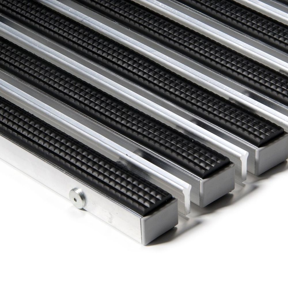 Gumová hliníková kefová vonkajšia vstupná rohož Alu Extra - dĺžka 60 cm, šírka 90 cm, výška 2,2 cm Základom rohože Alu Extra sú hliníkové profily o šírke 27 mm, ktoré sú spojené nerezovým lankom a oddelené gumovými medzikrúžkami, tým je umožnené stáčanie rohože a jednoduchšiu manipuláciu pri upratovaní. Do hliníkových profilov sa fixujú. gumové alebo textilné pásky, ktoré je možné ľubovoľne kombinovať a po opotrebení vymeniť. Medzi hliníkové profily je navyše možné vložiť hliníkovú škrabku. dostupné varianty materiálu aj farieb je možné nájsť vo fotogalérii. (samostatný kus): používa sa ako 1. čistiaca zóna na odstránenie hrubej nečistoty (kamienky, bahno, atp.) guma (výplň alu profilu): používa sa na rovnaké účely ako škrabka kefový pásik (výplň alu profilu): používa sa k rovnakým účely ako škrabka textil (výplň alu profilu): používa sa ako 2. čistiaca zóna na odstránenie jemných nečistôt (voda, prach) Kefkový pásik je možné zakúpiť v čiernej, bielej a hnedej farbe, viď fotogaléria. Textilnú alu výplň je možné zakúpiť v nasledujúcich farbách: čierna, šedá, svetlo modrá, tmavo modrá, žltá, eben, tmavo hnedá, zelená. , morská zelená a červená Technický popis variant: kombinácia guma (palička) + hliníková škrabka dĺžka: 600 mm - dĺžka plochy, ktorá čistí obuv v smere chôdze šírka: 900 mm - dĺžka prúžkov, niekedy tiež šírka dverí výška: 2,2 cm hmotnosť: 16 kg / m? zaťaženie: do 7 t / 100 cm? Montáž / inštalácia Rohož je možné v úrovni podlahy uložiť do pripraveného otvoru osadeného hliníkovým / nerezovým rámom šírky 25, výšky 25 a hrúbky 3 mm. Rohož je taktiež možné voľne položiť spolu s nábehovým rámom širokým 65 mm, príp. 45 mm pre rohože do max.