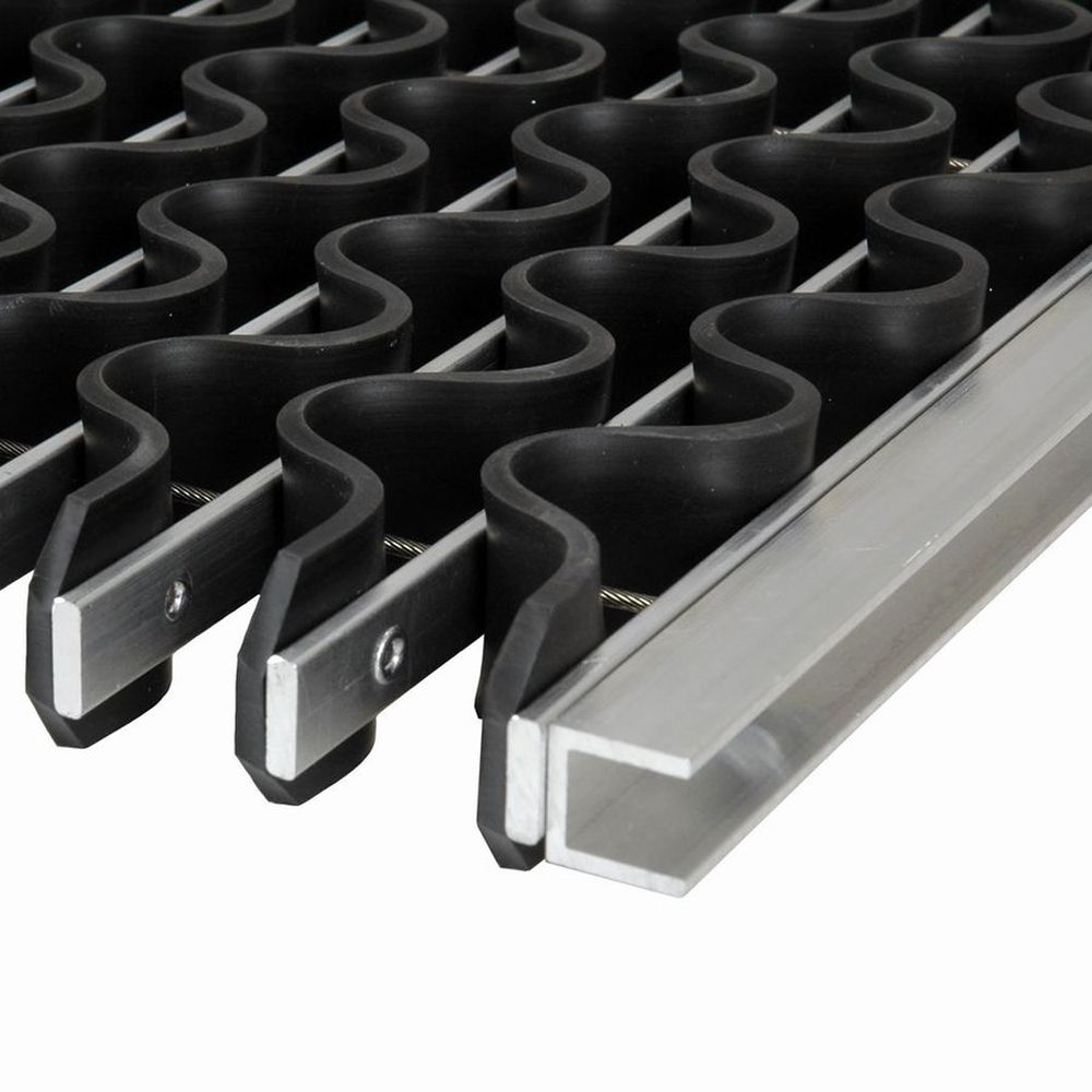 Hliníková gumová vonkajšia vstupná rohož Alu Wave - dĺžka 100 cm, šírka 150 cm, výška 2,8 cm Samočistiaca rohož Alu Wave je zložená z pružných gumových vlnoviek prinitovaných k hliníkovým pásikom. Vlnovka pod váhou človeka pruží a tým samočinne čistí obuv. Je dobré zvoliť takú dĺžku, aby návštevník po rohoži ušiel 3 až 5 krokov. Na kompletné očistenie obuvi odporúčame nadviazať tento typ rohože textilnou čistiacou zónou. Najčastejšie použitie vstupnej čistiacej zóny vstupné priestory letísk, hotelov, bánk, reštaurácií, administratívnych budov i rodinných domov Vlastnosti očistenia obuvi od hrubých nečistôt pred vstupom do objektov jednoduchá údržba rohož je možné použiť obojstranne nevhodnosť pre pojazd nákupných a paletových vozíkov Technický popis dĺžka: 1000 mm - dĺžka plochy, ktorá čistí obuv v smere chôdze šírka: 1500 mm - dĺžka prúžkov, niekedy tiež šírka dverí výška: 28 mm zaťaženie: do 2,5 t / 100 cm? hmotnosť: 10 kg / m? farba: čierna Montáž / inštalácia Rohož je možné v úrovni podlahy uložiť do pripraveného otvoru osadeného hliníkovým / nerezovým rámom šírky 30, výšky 30 a hrúbky 3 mm. Rohož je taktiež možné voľne položiť spolu s nábehovým rámom širokým 65 mm, popr. 45 mm pre rohože do max. dĺžky 120 cm.