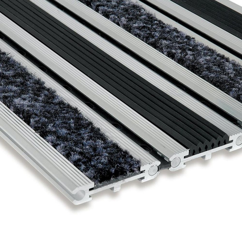 Textilná gumová hliníková vstupná rohož Wella - dĺžka 150 cm, šírka 100 cm, výška 1,4 cm Samonosná rohož Wella je vhodná pre priestory s veľkou náročnosťou na zaťaženie. Základom rohože sú široké ryhované hliníkové profily spojené pružnou ohybnou gumou, ktorá umožňuje celú rohož zrolovať. Hliníkové profily je možné vybaviť buď pílkovým gumovým pásikom na hrubú nečistotu alebo textilným pásikom na zachytenie jemnej nečistoty a vody. Pásky je možné ľubovoľne kombinovať a konkrétnu požiadavku je nutné špecifikovať pri objednávke. Dĺžka sa vždy prispôsobuje šírke hliníkového pásika - 60 mm. V prípade ľubovoľnej dĺžky, sa používa gumový koncový profil, ktorý zaručí presnú dĺžku rohože. Najčastejšie použitie druhá vstupná čistiaca zóna vstupné priestory obchodných centier, predajní, administračných budov, hotelov Vlastnosti očistenia obuvi od hrubých i jemných nečistôt jednoduchá údržba vďaka možnosti zrolovania odolnosť voči vysokému zaťaženiu vhodnosť aj pre pojazd nákupných a paletových vozíkov, áut Technický popis varianta: guma ( pílka) - textilný opasok (čierny) dĺžka: 1500 mm - dĺžka plochy, ktorá čistí obuv v smere chôdze šírka: 1000 mm - dĺžka prúžkov, niekedy tiež šírka dverí výška: 14 mm šírka hliníkového pásika: 60 mm zaťaženie: do 12,5 t / 100 cm? hmotnosť: 20 kg / m? Montáž / inštalácia Rohož je možné v úrovni podlahy uložiť do pripraveného otvoru osadeného hliníkovým / nerezovým rámom šírky 30, výšky 15 a hrúbky 3 mm. Rohož je taktiež možné voľne položiť spolu s nábehovým rámom širokým 45 mm.