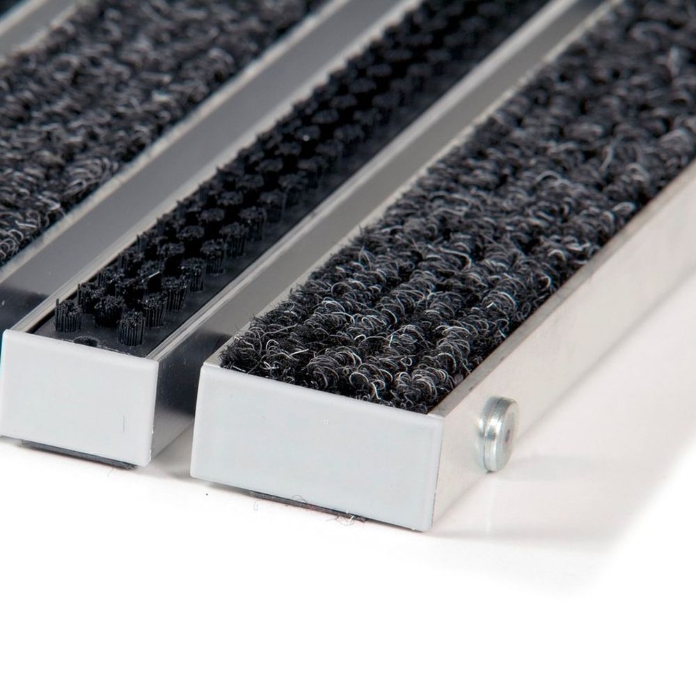 Textilná hliníková kefová vstupná rohož Alu Wide - dĺžka 60 cm, šírka 90 cm, výška 2,2 cm Základom rohože Alu Wide sú hliníkové profily o šírke 41 mm, ktoré sú spojené nerezovým lankom a oddelené gumovými medzikrúžkami, tým je umožnené stáčanie rohože a jednoduchšie. manipuláciu pri upratovaní. Do hliníkových profilov sa pevne fixujú textilné a kefové pásky, ktoré sa používajú ako čistiaca zóna na odstránenie hrubých nečistôt. Pásky je možné ľubovoľne farebne kombinovať a po opotrebení vymeniť. Najčastejšie použitie vstupnej čistiacej zóny vstupné priestory letísk, hotelov, bánk, reštaurácií, administratívnych budov i rodinných domov Vlastnosti vynikajúce očistenie obuvi od nečistôt pred vstupom do objektov jednoduchá údržba Technický popis dĺžka: 600 mm - dĺžka plochy, ktorá čistí obuv v smere chôdze šírka: 900 mm - dĺžka prúžkov, niekedy tiež šírka dverí výška: 2,2 cm zaťaženie: do 7 t / 100 cm? farba: čierna hmotnosť: 15-17 kg/m? Montáž / inštalácia Rohož je možné v úrovni podlahy uložiť do pripraveného otvoru osadeného hliníkovým / nerezovým rámom šírky 25, výšky 25 a hrúbky 3 mm . Rohož je taktiež možné voľne položiť spolu s nábehovým rámom širokým 65 mm, popr. 45 mm pre rohože do max. dĺžky 120 cm.