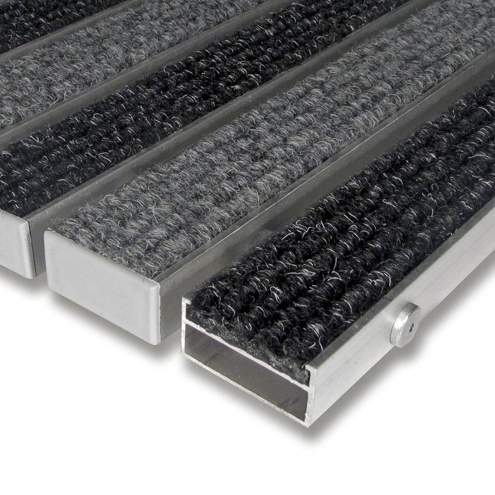 Textilná hliníková vstupná rohož Alu Wide - dĺžka 150 cm, šírka 100 cm, výška 2,2 cm Základom rohože Alu Wide sú hliníkové profily o šírke 41 mm, ktoré sú spojené nerezovým lankom a oddelené gumovými medzikrúžkami, tým je umožnené stáčanie rohože a jednoduchšie pri upratovaní. Do hliníkových profilov sa pevne fixujú textilné pásky, ktoré sa používajú ako vnútorná čistiaca zóna na odstránenie hrubých nečistôt. Pásky je možné ľubovoľne farebne kombinovať a po opotrebení vymeniť. Najčastejšie použitie vstupnej čistiacej zóny vstupné priestory letísk, hotelov, bánk, reštaurácií, administratívnych budov i rodinných domov Vlastnosti vynikajúce očistenie obuvi od nečistôt pred vstupom do objektov jednoduchá údržba Technický popis dĺžka: 1500 mm - dĺžka plochy, ktorá čistí obuv v smere chôdze šírka: 1000 mm - dĺžka prúžkov, niekedy tiež šírka dverí výška: 2,2 cm zaťaženie: do 7 t / 100 cm? farba: čierna hmotnosť: 15-17 kg/m? Montáž / inštalácia Rohož je možné v úrovni podlahy uložiť do pripraveného otvoru osadeného hliníkovým / nerezovým rámom šírky 25, výšky 25 a hrúbky 3 mm . Rohož je taktiež možné voľne položiť spolu s nábehovým rámom širokým 65 mm, popr. 45 mm pre rohože do max. dĺžky 120 cm.