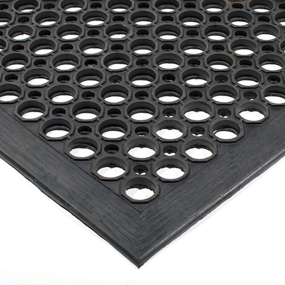 Čierna gumová protiúnavová protišmyková olejovzdorná rohož (okraj) - dĺžka 150 cm, šírka 90 cm, výška 1,2 cm Čierna gumová modulárna priemyselná protiúnavová protišmyková olejovzdorná rohož vyrobená z prírodnej gumy a 25% nitrilovej zmesi. Pohodlný povrch rohože zmierňuje únavu spôsobenú dlhým státím. Spojovacie moduly umožňujú pokryť ľubovoľne dlhú plochu šírky 0,9 metra. Táto varianta rohože je vyrobená so zámkom na jednej z dlhších strán. Rohož je možné vyčistiť vodou cez tlakovú hadicu s jemným čistiacim prostriedkom. Najčastejšie použitie pracoviska s obrábacími strojmi priestormi za barom alebo v kuchyni Vlastnosti protišmykovosť zaistená aj v mokrom prostredí zvýšeným kruhovým povrchovým vzorom norma protišmykovosti EN 13552 kategórie R10 odtok tekutín zaistený otvormi v rohoži zvýšená odolnosť voči minerálnym olejom, agresívnym strojovým chladiacim kvapalinám variant: spojovací koncový diel, na jednej z dlhších strán materiál: prírodná guma, 25 % nitrilová zmes farba: čierna dĺžka: 150 cm šírka: 90 cm výška: 1,2 cm hmotnosť: 9 kg prevádzková teplota: -10 až +65 °C