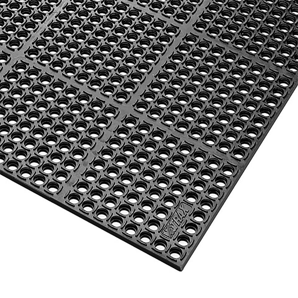 Čierna extra odolná olejovzdorná modulová rohož Safety Stance 100% nitril - dĺžka 150 cm, šírka 90 cm, výška 2,2 cm Prvotriedna priemyselná rohož je vyrobená z extrémne odolných materiálov, ktoré sú recyklovateľné v súlade so smernicou REACH. Drenážne otvory spoločne s výstupkami na spodnej strane umožňujú prepadávanie nečistôt a pomáhajú odvádzať tekutiny z povrchu rohože, ktorý vďaka tomu zostáva suchý a čistý. Povrch rohože je vysoko adhezívny, spodná strana má protišmykovú úpravu. Rohož je dodávaná bez nábehovej hrany. V prípade potreby je možné jednotlivé rohože jednoducho spojiť pomocou spojky, ktorú nájdete v súvisiacom tovare a pokryť tak potrebnú plochu, bez rizika posunu rohoží. Pre bezpečnejší prístup na rohož je možné okraje plochy doplniť o nábehové hrany, ktoré taktiež nájdete v súvisiacom tovare. Použitie Rohož sa vďaka špeciálnej zmesi, ktorá je vyvinutá na styk s priemyselnými olejmi a chemikáliami, hodí do prevádzok s častými únikmi/odkvapmi oleja alebo chemikálií. Materiál je vyrobený bez prímesi silikónu, a tak je rohož vhodná aj do lakovní. Je dostatočne mäkká, takže pri dlhodobom státí znižuje únavu. Hodí sa do výroby s viacsmennou prevádzkou. Pravidelné čistenie tlakovou vodou predlžuje jej životnosť. Technický popis farba: čierna materiál: 100% nitrilový kaučuk dĺžka: 90 cm šírka: 150 cm výška: 2,2 cm hmotnosť: 15,7 kg plošná hmotnosť: 13 kg/m? zaťaženie rohože: veľké nehorľavosť: ÁNO (ASTM D2859) statický koeficient trenia: 0,65 (ASTM C1028-96) trieda protišmykovosti R10 (DIN 51 130, BGR 181) tvrdosť: 33 Shore A (ASTM D2240-02) odolnosť v odere (strata hmotnosti): 1000 cyklov: 3,1 % (ASTM D3884-01)