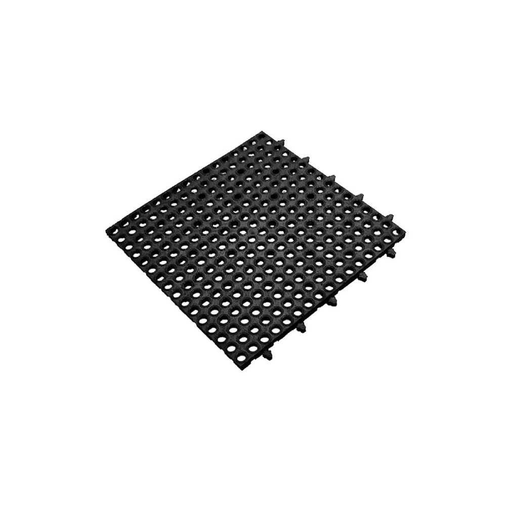 Čierna gumová dierovaná protišmyková rohož Tough - dĺžka 48 cm, šírka 48 cm, výška 2 cm Táto čierna protišmyková dierovaná rohož Tough je perfektnou voľbou ako rohož do mokrého prostredia. Drenážne otvory umožňujú odvetrávanie, pretekanie tekutín a prepadávanie nečistôt, povrch tak zostáva suchý a čistý. Pravidelné čistenie saponátom a tlakovou vodou predlžuje ich životnosť. A vďaka použitému recyklovanému materiálu z ktorého je rohož tvorená je aj ekonomickým riešením. Najčastejšie použitie priemyselné prostredie sprchy Vlastnosti protišmyková norma DIN 51130 (R10) vhodná do mokrého a vlhkého prostredia všeobecná odolnosť voči chemikáliám, olejovzdorná protišmykovosť spĺňajúca DIN 51130 (R10) ekonomické a ekologické riešenie, vďaka recyklovanému materiálu ľahko sa čistí Technický popis materiál: recyklovaná guma a plast farba: čierna dĺžka: 48 cm šírka: 48 cm výška: 2 cm priemer otvorov: 1,6 cm hmotnosť: 1,95 kg teplotná stabilita: 0 až 140 °C Údržba Odporúčame čistiť dezinfekčnými prostriedkami alebo sterilnou parou ktorý dôkladne opláchnite. Aby nebola ovplyvnená odolnosť voči šmyku. Rohož by nemala byť vystavená častému slnečnému svitu. Montáž / inštalácia voľné položenie na podlahu prilepenie na podlahu trvalým lepidlom: F44, pre mokré prostredie F74 / F81 / F84 prilepenie na podlahu dočasným lepidlom: F41