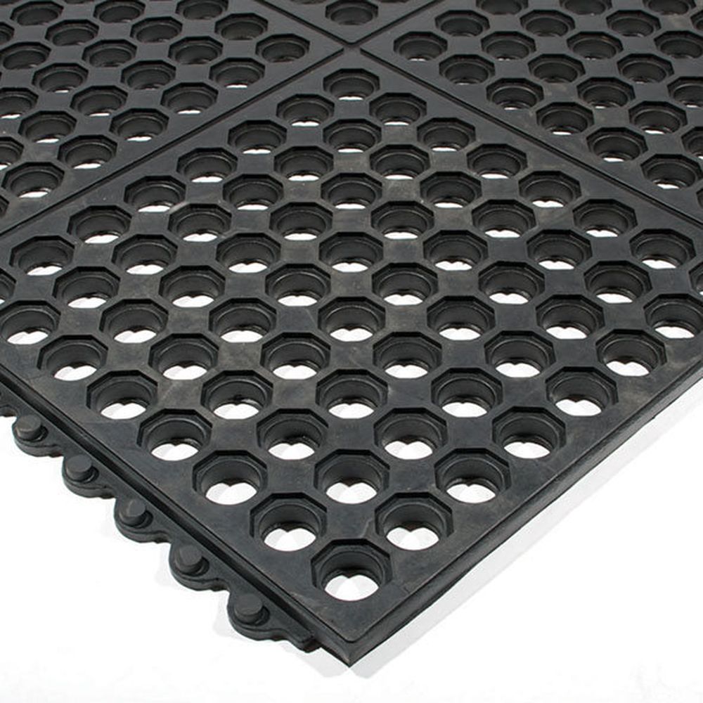 Čierna gumová protiúnavová protišmyková dierovaná rohož Fatigue 100% nitril - dĺžka 90 cm, šírka 90 cm, výška 1,8 cm Spojovacia dlaždice vyrábaná z nitrilovej gumy Tento typ rohože sa svojou variabilitou hodí do akejkoľvek prevádzky. únavu a zvyšuje výkonnosť pracovníkov. Jednotlivé dlaždice je možné jednoducho vymeniť alebo presunúť. K rohoži je možné samostatne dokúpiť čierne alebo žlté nábehové hrany. protišmyková norma EN 13552 v kategórii R10 odolnosť proti UV žiareniu obmedzená odolnosť voči chemikáliám, olejom a mazivám dierovania rohože účinne odvádza rozliate tekutiny odolnosť voči odletujúcim čiastočkám pri zváraní Technický popis materiál: 100% nitril dĺžka: 92 cm šírka: 92 cm nášľapná plocha: 90 x 90 cm výška: 1 : -20 až +160 °C farba: čierna hmotnosť: 10 kg Montáž / inštalácia voľné položenie spojenie rohoží pomocou zámkového systému po ich obvode
