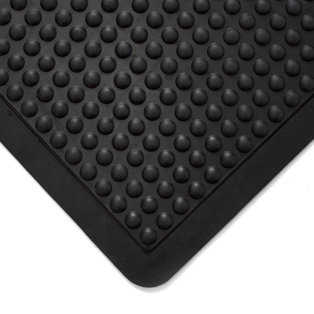 Čierna gumová protiúnavová rohož (okraj) - dĺžka 90 cm, šírka 60 cm, výška 1,4 cm Rohož je vyrábaná zo zmesi pružnej a tuhej prírodnej gumy. Bublinkový povrch stimuluje krvný obeh v chodidlách, nohách a celom tele. Rohož izoluje pracovníkov od chladu z betónových podláh. Rohož je možné zakúpiť vo variantoch: samostatný lemovaný, stredový alebo koncový diel. Je teda možné vytvoriť behúň s ľubovoľnou dĺžkou so šírkou 60 cm. Čistenie Na odstránenie nečistôt použite vysokotlakovú hadicu (nesmie presiahnuť 60 psi). Nepoužívajte paru, odmasťovacie alebo korozívne chemikálie. Rohož nedrhnite. Najčastejšie použitie miesta s prácou v statickej polohe Vlastnosti odolnosť voči vode a väčšine bežných kyselín Technické údaje variant: spojovací koncový diel, na jednej z kratších strán materiál: 100% prírodná guma (a ďalšie bežné schválené gumárenské chemikálie) farba: čierna dĺžka: 93 cm šírka: 60 cm výška: 1,4 cm nášľapná plocha: 90 x 60 cm (doska má zámky) hmotnosť: 6,35 kg prevádzková teplota: -20 až +50 °C účinnosť: 30 BPN podľa ASTM E304 Montáž / inštalácia voľné položenie spojenie s ďalšími rohožami pomocou zámkov (podľa varianty)