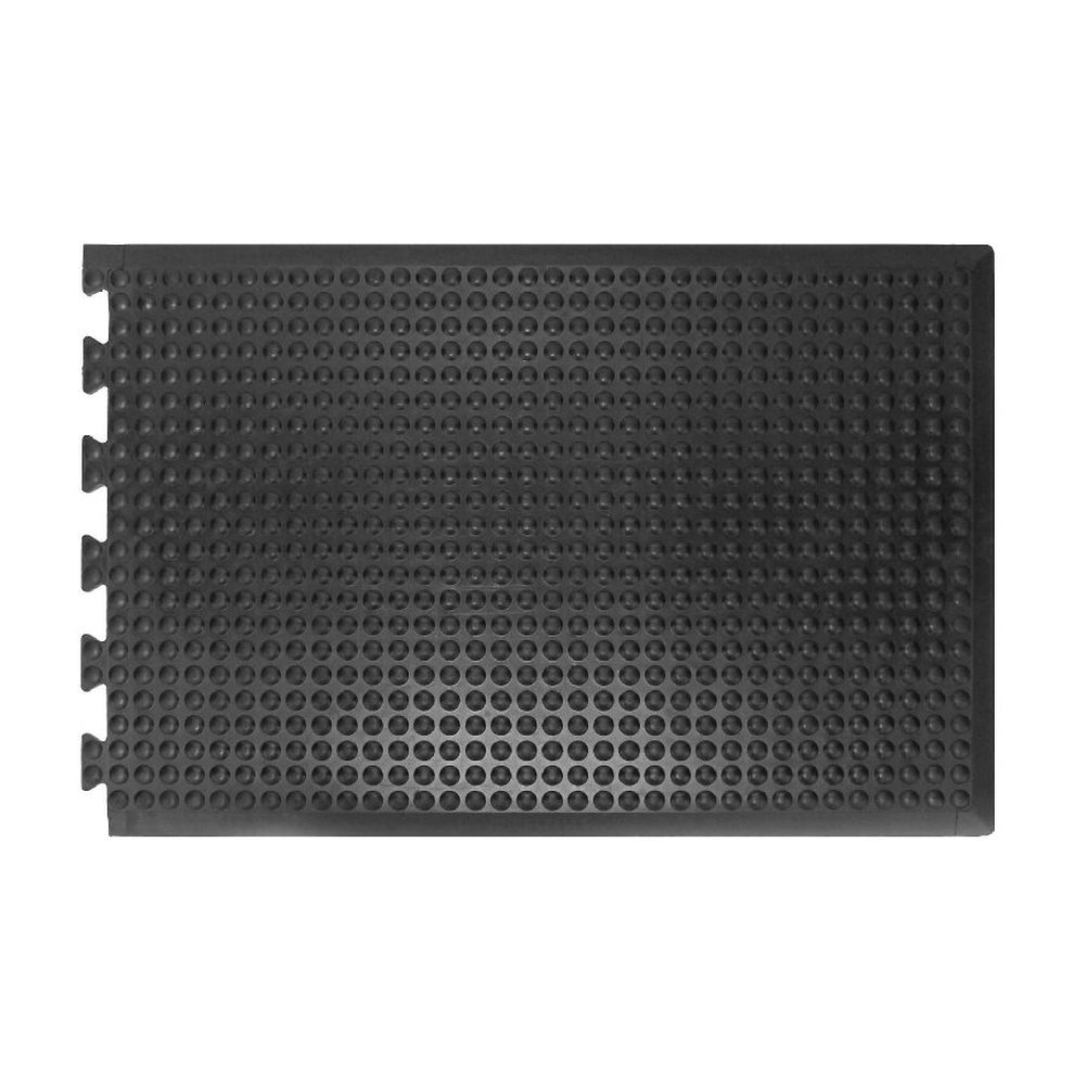 Čierna gumová protiúnavová rohož (25% nitrilová guma) (okraj) - dĺžka 90 cm, šírka 60 cm, výška 1,4 cm Rohož je vyrábaná zo zmesi prírodnej a nitrilovej gumy. Bublinkový povrch stimuluje krvný obeh v chodidlách, nohách a celom tele. Rohož izoluje pracovníkov od chladu z betónových podláh. Rohož je možné zakúpiť vo variantoch: samostatný lemovaný, stredový alebo koncový diel. Je teda možné vytvoriť behúň s ľubovoľnou dĺžkou so šírkou 60 cm. Čistenie Na odstránenie nečistôt použite vysokotlakovú hadicu (nesmie presiahnuť 60 psi). Nepoužívajte paru, odmasťovacie alebo korozívne chemikálie. Rohož nedrhnite. Najčastejšie použitie miesta s prácou v statickej polohe Vlastnosti odolnosť voči vode a väčšine bežných kyselín Technické údaje variant: spojovací koncový diel, na jednej z kratších strán materiál: 75% prírodný / 25% nitrilová guma farba: čierna dĺžka: 93 cm šírka: 60 cm výška: 1,4 cm nášľapná plocha: 90 x 60 cm (doska má zámky) hmotnosť: 5 kg prevádzková teplota: -20 až +50 °C účinnosť: 30 BPN podľa ASTM E304 Montáž / inštalácia voľné položenie spojenia s ďalšími rohožami pomocou zámkov (podľa varianty)