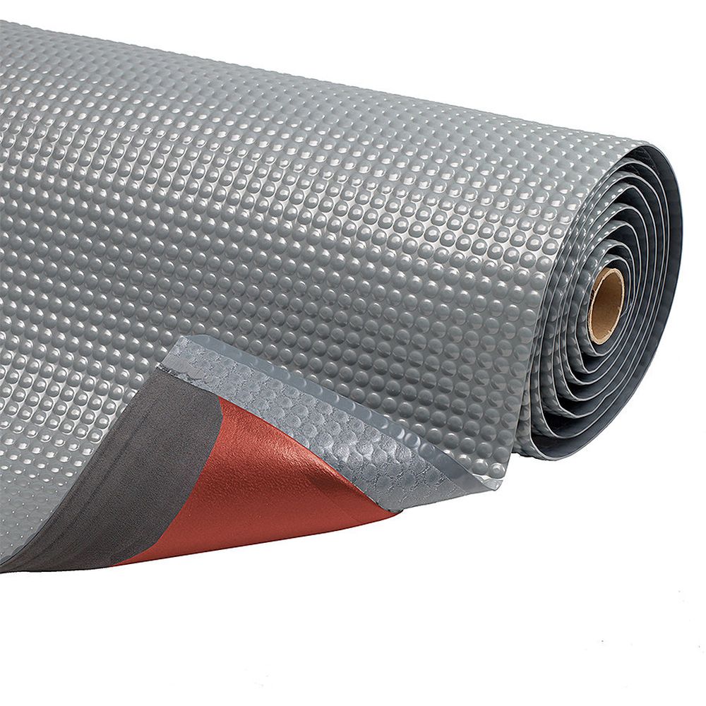 Sivá protiúnavová laminovaná rohož (rola) Sky Trax - dĺžka 21,9 m, šírka 122 cm, výška 1,9 cm Priemyselná protiúnavová laminovaná rohož Sky Trax zaisťuje vysoký komfort pracovníkov pri dlhom státí na pracovisku, zmierňuje únavu pri dlhodobom státí a chráni pracovníkov negatívnymi vplyvmi studených podláh. Vďaka laminovanému PVC povrchu má oveľa dlhšiu životnosť ako bežné vinylové protiúnavové rohože. Kombinuje povrch vysoko odolný proti oteru s pružným podkladom z mikrobunkového vinylu, znižujúcim únavu pracovníkov. Po obvode je vybavená nábehovou hranou na prevenciu zakopnutia. Rubová strana je vybavená membránou RedStop brániacou posúvaniu rohože. Protiúnavové rohože sú nalaminované oteruvzdorným povrchom na mikrobunkový vinylový podklad a sú vyrábané pre maximálnu životnosť a vysoký pracovný komfort. Povrchová úprava spoločne s dezénom "bublinky" zabezpečuje dobrú oporu podrážkam a zároveň dovoľuje ľahké otáčanie pracovníkov a protišmykovú ochranu. Najčastejšie použitie automobilový priemysel výrobnej linky montážnej plochy Vlastnosti určené pre vysokú záťaž a suché priemyselné prostredie odolné voči väčšine priemyselných tekutín a chemikálií neobsahuje DOP, DMF, látky poškodzujúce ozónovú vrstvu neobsahuje silikón ani ťažké kovy všetky štyri strany opatrené nábehovou hranou podklad povrch o hrúbke 5 mm koeficient trenia: 0,82 (ASTM C1028-96) tvrdosť: 95 Shore A (ASTM D2240-02) trieda protišmykovosti R9 (DIN 51 130, BGR 181) odolnosť voči oderu (strata hmotnosti) 500 cyklov: 0,1 % D3884-01) požiarna odolnosť Cfl-S2 podľa normy ISO 13501 Technické údaje podklad: mikrobunkový vinyl s výškou 1,4 cm povrch: laminovaný PVC povrch s výškou 0,5 cm dĺžka: 21,9 m šírka: 122 cm výška: 1,9 cm farba: šedá dezén : bublinky hmotnosť: 188 kg hmotnosť: 6,3 kg/m?