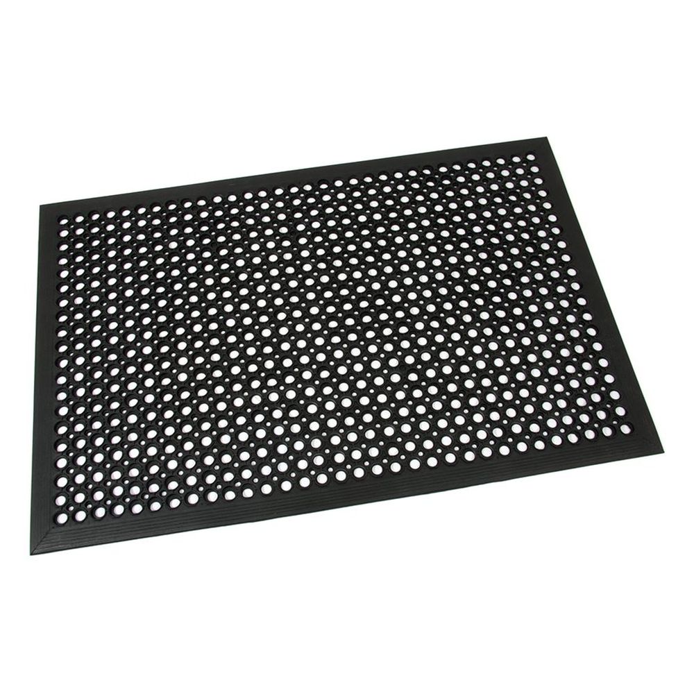 Čierna gumová protiúnavová protišmyková olejovzdorná rohož (75% nitrilová guma) Workmate - dĺžka 120 cm, šírka 80 cm, výška 1,4 cm Olejovzdorná priemyselná rohož Workmate je ideálnym pomocníkom do prevádzok, ktoré vyžadujú dlhodobé státie pracovníkov a vymastujú sa kožou. Svoje uplatnenie rohož nájde vo výrobných prevádzkach pri obrábacích stojoch, sústruhoch, vŕtačkách, ale aj v gastro prevádzkach - kuchyniach, pri montážnych linkách a pod. Najčastejšie použitie pracoviska s obrábacími strojmi - sústruhy, vŕtačky, frézy atď. vyrobená z prírodnej gumy s prímesou nitrilu (75%) vďaka prímesi nitrilu je rohož vhodná aj pre pracoviská, kde dochádza k styku s olejmi - zvýšená odolnosť voči minerálnym olejom, agresívnym strojovým chladiacim kvapalinám, zvieracím tukom zmierňuje únavu pri dlhšom státí, izoluje od studenej podlahy zvýšený kruhový povrch má vynikajúci protišmykový účinok otvory rohoži zaisťujú odvod tekutín a prepadávanie nečistôt z výroby obvodová nábehová hrana znižuje riziká zakopnutia a umožňuje ľahký prejazd vozíkov Technický popis farba: čierna materiál: prírodná guma, 75 % nitrilová zmes dĺžka: 120 cm šírka: 80 cm výška: 1,4 cm hmotnosť: 6,1 kg prevádzková teplota: -10 až +65 °C