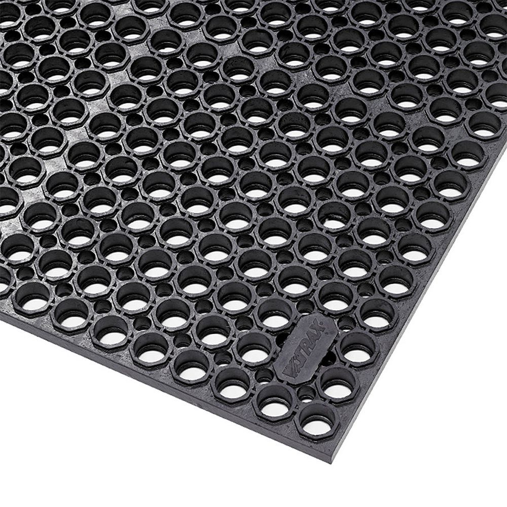 Čierna gumová protiúnavová rohož Sanitop Deluxe - dĺžka 91 cm, šírka 152 cm, výška 2 cm Čierna gumová protiúnavová protišmyková priemyselná rohož Sanitop Deluxe je rohož do mokrého prostredia. Drenážne otvory umožňujú odvetrávanie, pretekanie tekutín a prepadávanie nečistôt, povrch tak zostáva suchý a čistý. Pravidelné čistenie saponátom a tlakovou vodou predlžuje ich životnosť. Neobsahujú silikón, sú vhodné aj do lakovní. Tvrdá gumová zmes garantuje dlhú životnosť rohoží. Povrch je silne nekĺzavý. Rohože sa vďaka svojej váhe a súčiniteľovi trenia materiálu neposúvajú. Kolmé okraje rohoží umožňujú pokrývať priestory rôznych tvarov i veľkostí spájaním rohoží za sebou aj vedľa seba za použitia gumových spojok, ktoré nájdete v súvisiacom tovare. Vlastnosti a použitie dierovaná rohož pre suché i mokré prostredie protišmyková rohož pre vysokú záťaž 100% prírodná gumová zmes pre všeobecné použitie neobsahuje DOP, DMF, látky poškodzujúce ozónovú vrstvu neobsahuje silikón ani ťažké kovy koeficient trenia: 0,59 (ASTM C102 : 52 Shore A (ASTM D2240-02) odolnosť voči oderu (strata hmotnosti) 1000 cyklov: 6 % (ASTM D3884-01) požiarna odolnosť (vznietenie) CPSC FF 1-70: spĺňa normu ASTM D2859 Technický popis materiál: 100% prírodná gumová zmes dĺžka: šírka: 152 cm výška: 2 cm hmotnosť: 17 kg hmotnosť: 12,3 kg/m? farba: čierna