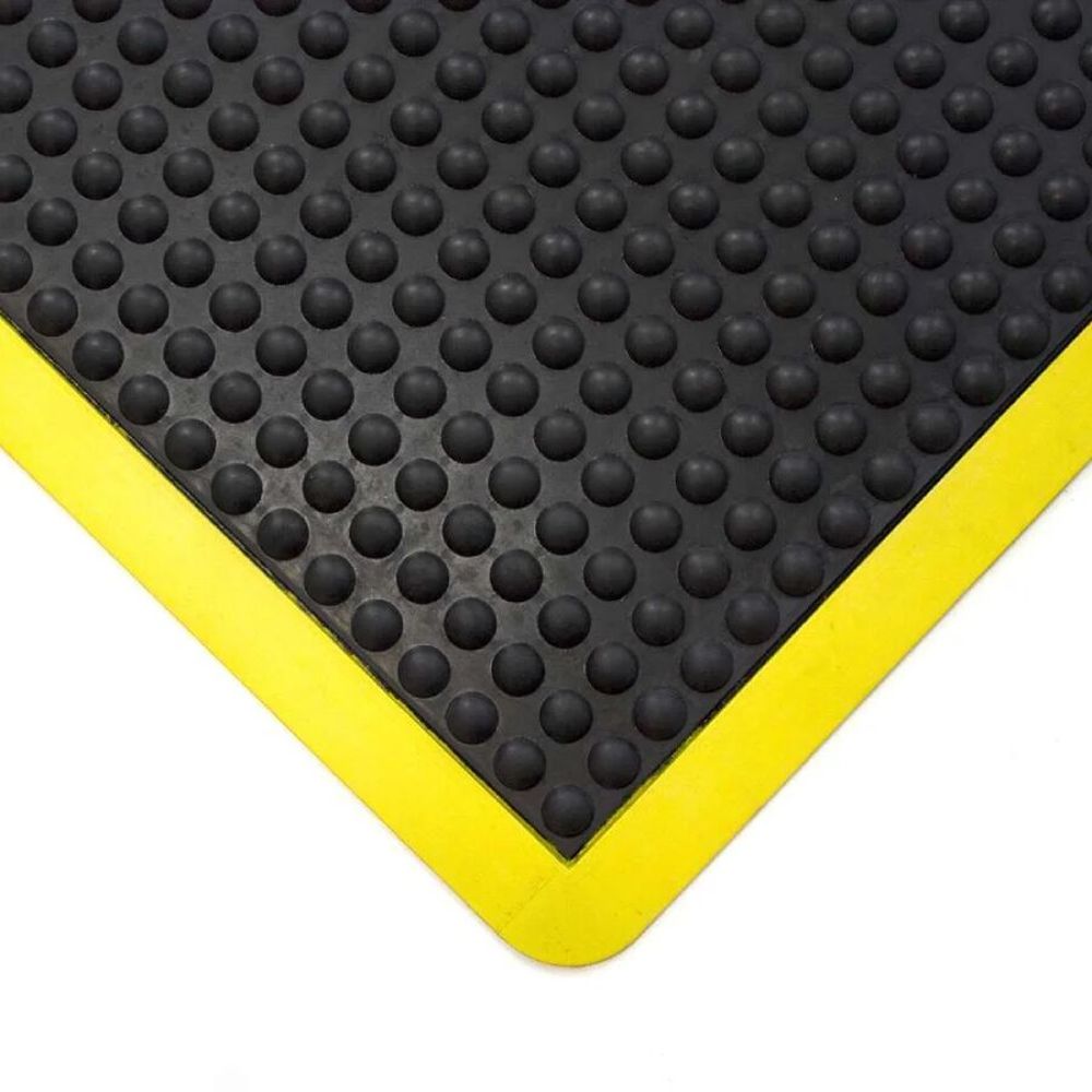 Čierno-žltá gumová protiúnavová rohož Bubble - dĺžka 90 cm, šírka 60 cm, výška 1,4 cm Rohož je vyrábaná zo zmesi pružnej a tuhej prírodnej gumy. Bublinkový povrch stimuluje krvný obeh v chodidlách, nohách a celom tele. Rohož izoluje pracovníkov od chladu z betónových podláh. Rohož je možné zakúpiť vo variantoch: samostatný lemovaný, stredový alebo koncový diel. Je teda možné vytvoriť behúň s ľubovoľnou dĺžkou so šírkou 60 cm. Čistenie Na odstránenie nečistôt použite vysokotlakovú hadicu (nesmie presiahnuť 60 psi). Nepoužívajte paru, odmasťovacie alebo korozívne chemikálie. Rohož nedrhnite. Najčastejšie použitie miesta s prácou v statickej polohe Vlastnosti odolnosť voči vode a väčšine bežných kyselín odolnosť voči UV žiareniu Technické údaje variant: samostatný kus, celkové olemovanie materiál: 100% prírodná guma farba: čierno-žltá dĺžka: 90 cm šírka: 60 cm výška: 1,4 cm hmotnosť: 5 kg prevádzková teplota: -20 až +50 °C pevnosť: 435 PSI (3 MPa) Montáž / inštalácia voľné položenie