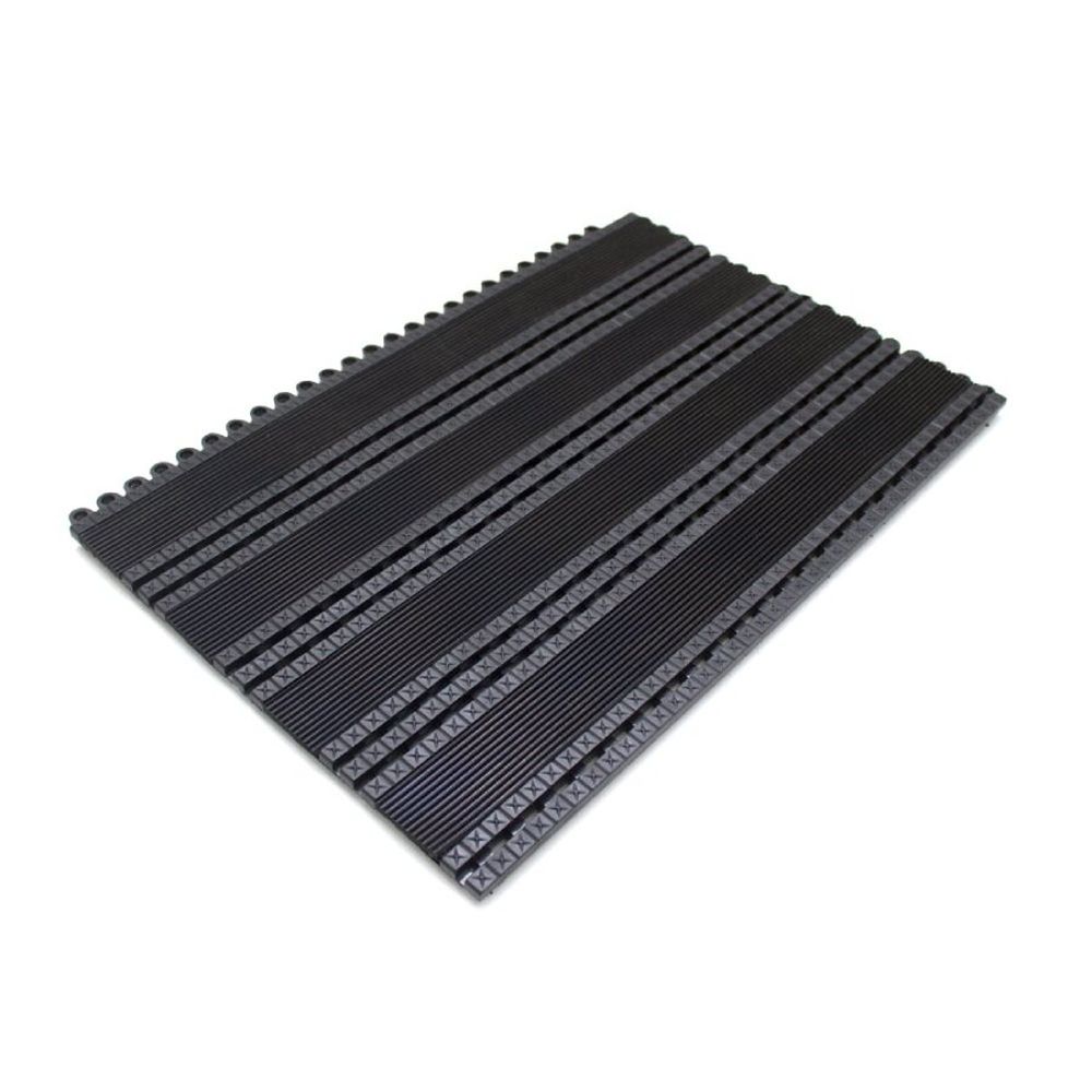 Čierna textilná záťažová dierovaná vstupná rohož Premier Ribbed (Cfl-S2) - dĺžka 44 cm, šírka 29 cm, výška 1,4 cm Vďaka tejto záťažovej dierovanej rohoži Premier Ribbedsi môžete zostaviť vstupnú rohož pre miesta, ktoré sú vystavené vysokej záťaži. Tento modelový rad rohože Premier Ribbed je zložený z gumových drážok, ktoré odstraňujú nečistoty a plastová dierovaná časť zaisťuje odvod prebytočnej vody. Tento model záťažovej rohože je unikátny svojou požiarnou odolnosťou (Cfl-S2) oproti ostatným rohožiam tohto typu. Modulárny systém ponúka flexibilitu pre zostavenie verzie v závislosti od typu vstupu, priania zákazníka a množstva nečistôt / vody. Vďaka svojim vlastnostiam, dokáže odstrániť nečistoty aj štrk a tiež inštalácia a manipuláciu je veľmi jednoduchá. Tieto vlastnosti robia z tejto rohože lacnejší variant ako sú rohože v hliníkových profiloch. Túto vstupnú rohož môžete nakombinovať s ďalšími modelmi tejto vstupnej rohože, ktoré nájdete ako súvisiaci tovar. Tiež je ekologická voči životnému prostrediu, pretože je vyrobená z recyklovaného PVC. Najčastejšie použitie miesta s vysokým prevádzkovým zaťažením vstupy do obchodov, komerčných budov, hotelov atď. pre vnútorné použitie Vlastnosti produkt je vyrobený z pružného PVC materiálu, ktorý vydrží vysokú intenzitu prevádzky vysoká odolnosť proti sklzu vďaka gumovému a modulárnemu riešeniu zvyšuje bezpečnosť testované pre použitie pre nákupné vozíky vhodné na chôdzu s vysokými podpätkami perfektné odstraňovanie nečistôt, štrku a vody, vďaka tvaru a materiálu čistiacej plochy odolnosť voči ohňu podľa požiarnej trieda Cfl-S2 ekologický produkt ktorý je vyrobený z recyklovaného PVC jednoduchá a rýchla inštalácia, montáž a demontáž (nie je potrebné dlho čakať na špeciálnu jednoduchá údržba a čistenie Technické údaje materiál: recyklované PVC s vložkami z prírodného kaučuku farba: čierna dĺžka: 44 cm šírka: 29 cm výška: 1,4 cm hmotnosť rohože: 1,4 kg trieda požiarnej odolnosti: Cfl-s2 Montáž / inštalácia dlaždice možno ľahko rezať tak, aby vyhovovali rozmerom, najlepšie pomocou priamočiarej píly alebo noža produkt by mal byť inštalovaný do priehlbiny, kvôli prípadnému odtoku vody