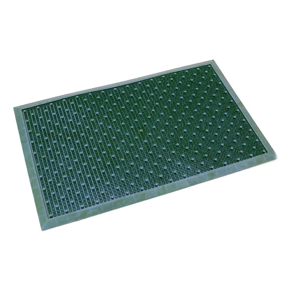 Zelená vonkajšia vstupná rohož Dots - dĺžka 48 cm, šírka 76 cm, výška 1,8 cm Vstupná čistiaca rohožka vhodná na odstránenie drobných nečistôt - bahno, tráva, zvyšky snehu. Rohožka je najčastejšie pred dverami bytov, rodinných domov či kancelárií. Vďaka svojmu designu často slúži aj ako dizajnový doplnok, poprípade ako odkladacia plocha pre mokrú obuv. Najčastejšie použitie pred dvere do bytu, rodinného domu, kancelárie slúži aj ako dizajnový doplnok niekedy používaná aj ako odkladacia plocha pre mokrú obuv. ostriekaním hadicou či pomocou kefky a opláchnutím vo vode Technický popis design: Dots farba: zelená materiál: 100% recyklovaný polyester dĺžka: 48 cm šírka: 76 cm výška: 1,8 cm hmotnosť: 1,35 kg