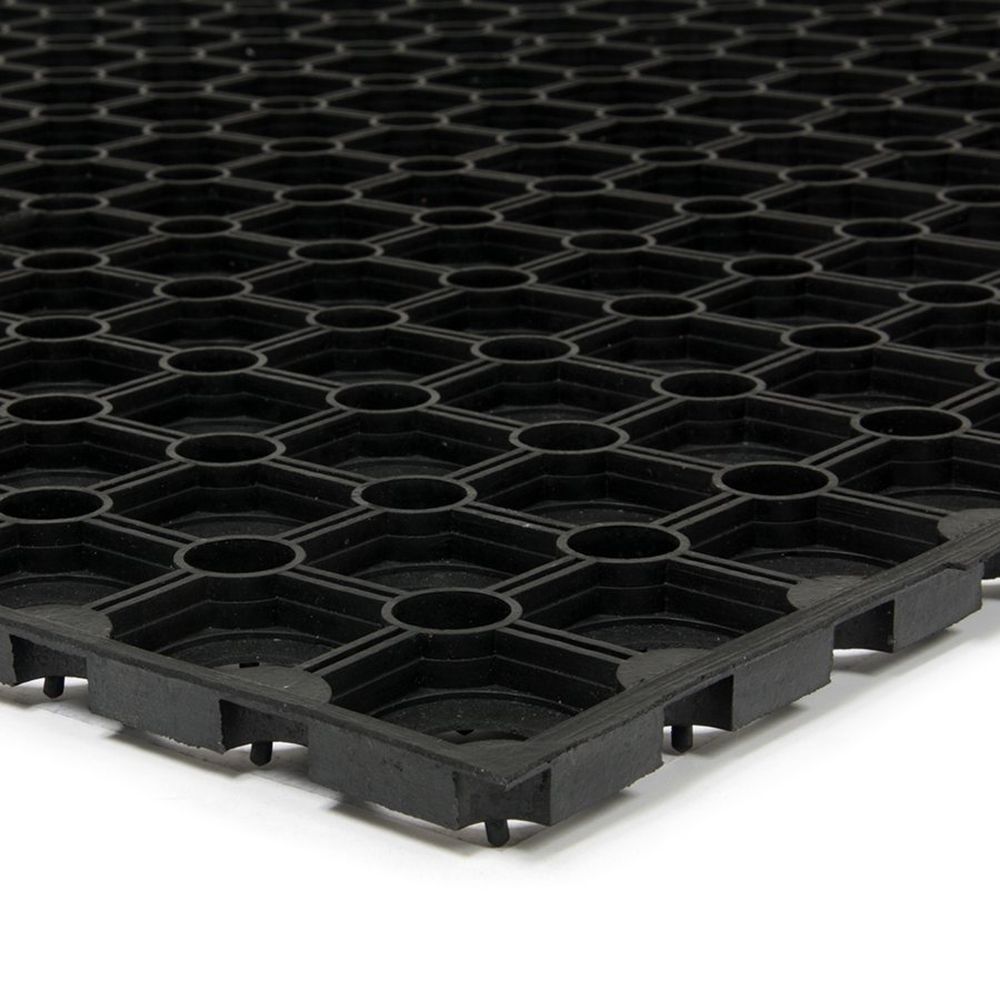 Gumová vonkajšia vstupná rohož Honeycomb - dĺžka 45 cm, šírka 75 cm, výška 1,6 cm Vonkajšia gumová vstupná rohož Honeycomb je vhodná na odstránenie hrubých nečistôt ako je sneh a bahno. Túto rohožku najčastejšie vidíte ako vstupnú čistiacu rohož pri vstupoch do budov. Možno použiť aj ako zatrávňovaciu rohož na zatrávnenie namáhaných plôch. Gumová rohož Honeycomb nie je vhodná na prejazd nákupného vozíka, na tento účel sú vhodné rohože Octomat, Karwell poprípade Oktáva. K rohoži predávame aj hliníkový rám na zníženie rizika zakopnutia a spojky, ktoré zaistia lepšiu súdržnosť rohoží pri pokládke niekoľkých kusov vedľa seba. Najčastejšie použitie samostatná vstupná čistiaca rohož pred dverami do budovy (často nahrádza kovový čistiaci rošt) možno použiť aj ako zatrávňovaciu rohož Vlastnosti veľmi odolná gumová rohož s dlhou životnosťou aj v náročných vonkajších podmienkach efektívne čistí obuv a je preto ideálna pre blatisté a zasnežené miesta otvory vo tvaru medových plástov umožňujú prepadávanie nečistôt, povrch rohože zostáva suchý a čistý na rube je rohož odsadená od povrchu, čo umožňuje jednoduchý odvod vody veľkosť rohože sa dá ľahko ľubovoľne zmenšiť na požadovaný rozmer nie je vhodná pre prejazd nákupného vozíka Technický popis materiál: guma (guma) dĺžka: 45 cm šírka: 75 cm výška : 1,6 cm hmotnosť: 1,6 kg Montáž / inštalácia voľne položená pri vstupe do budovy (možno vložiť do hliníkového rámu) zapustená v podlahe ako súčasť čistiacej zóny (vstupy budov) veľká gumová plocha ako podlahovina pri lyžiarskych vlekoch a lanovkách rohože je možné spájať pomocou gumových spojok je možné použiť aj ako zatrávňovaciu rohož