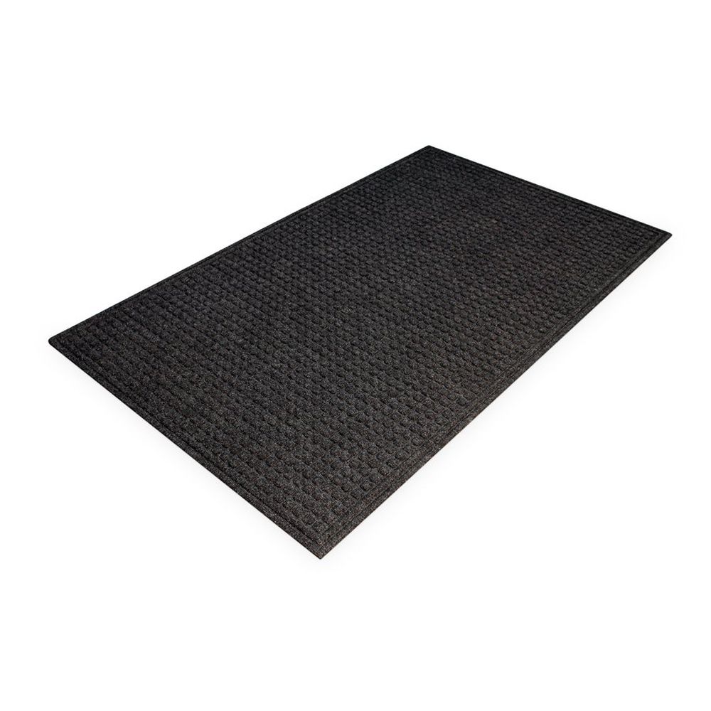 Čierna plastová vstupná rohož - dĺžka 90 cm, šírka 150 cm, výška 1 cm Robustná vstupná vnútorná rohož kompletne vyrobená z recyklovaného materiálu. Podložka je vyrobená z recyklovanej gumy, ktorá zamedzuje pohybu rohože po podlahe. fliaš. Vlákna dobre čistia podrážky od nečistôt a sutiny. Rohož je po krajoch ukončená lemovaním. Vlastnosti odolnosť voči UV žiareniu vlákno rohože je vyrobené z recyklovaných plastových fliaš Technický popis materiál: recyklované PVC fľaše, guma, polyesterový koberec, SBR farba: čierna dĺžka: 90 cm šírka: 150 cm výška: 1 cm hmotnosť : 3,7 kg / m?