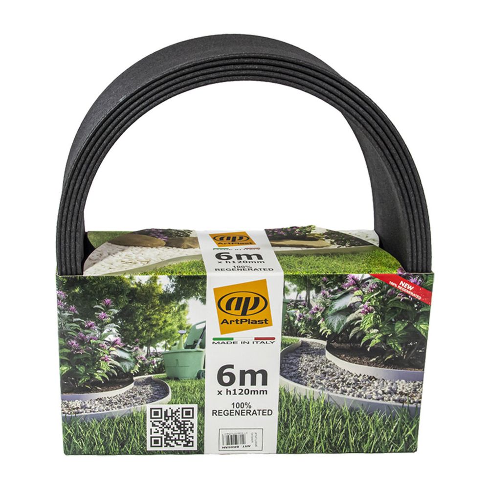Antracitový plastový vymedzovací záhradný obrubník - dĺžka 6 m Najčastejšie použitie ohraničenia plôch, trávnikov alebo ciest detské ihriská, športoviská, pieskoviská záhrady, bazény, kúpaliská Vlastnosti odolnosť voči teplotám medzi -50 °C až +50 °C odolnosť proti UV žiareniu Technické údaje farba: antracitový materiál: PP dĺžka: 6 metrov hrúbka: 4 mm výška: 12 cm hmotnosť: 2350g teplotná stabilita: -50 °C až +50 °C v balení 5 ks - 4 metre, spojka a upevňovacia kotva