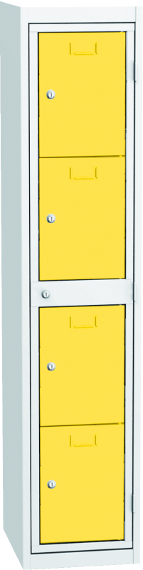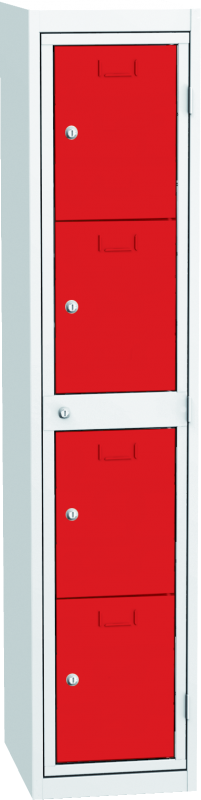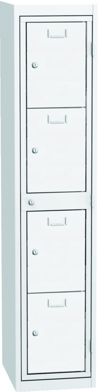 Výdajná skriňa na výmenu pracovných odevov Štyri výdajné schránky v centrálnom ráme. Štyri výdajné schránky v centrálnom ráme. a rámu je jednobodové, umiestnené uprostred. Zámok je štandardne cylindrický s dvomi kľúčmi, alebo môžu byť dvere a rám vybavené otočným uzáverom pre visiaci zámok (visací zámok nie je súčasťou dodávky). Cylindrický zámok má 2000 kombinácií a umožňuje dodanie hlavného kľúča. Šatníková skriňa je možné vybaviť šikmou strechou, tá zabraňuje odkladaniu odpadkov na strechu skrine a uľahčuje jej čistenie. Uzamykateľné schránky môžu mať miesto prelisu na papierovú menovku, plastový štítok na vloženie menovky.