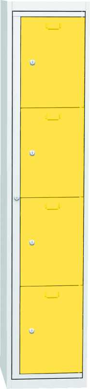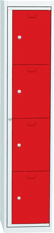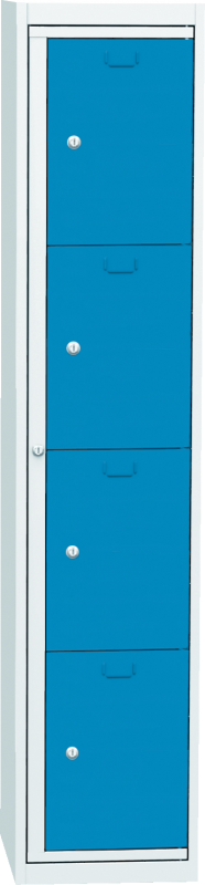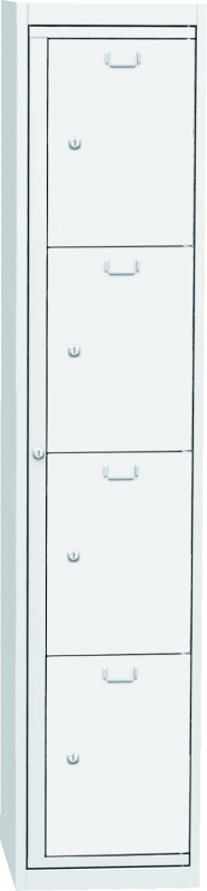 Výdajná skriňa na výmenu pracovných odevov Štyri výdajné schránky v centrálnom ráme. Štyri výdajné schránky v centrálnom ráme. a rámu je jednobodové, umiestnené uprostred. Zámok je štandardne cylindrický s dvomi kľúčmi, alebo môžu byť dvere a rám vybavené otočným uzáverom pre visiaci zámok (visací zámok nie je súčasťou dodávky). Cylindrický zámok má 2000 kombinácií a umožňuje dodanie hlavného kľúča. Šatníková skriňa je možné vybaviť šikmou strechou, tá zabraňuje odkladaniu odpadkov na strechu skrine a uľahčuje jej čistenie. Uzamykateľné schránky môžu mať miesto prelisu na papierovú menovku, plastový štítok na vloženie menovky.
