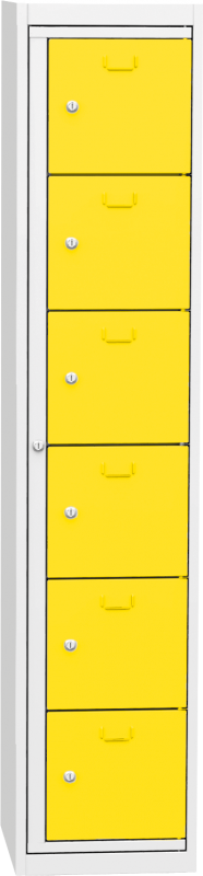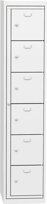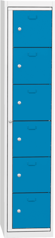 Výdajná skriňa na výmenu pracovných odevov Šesť výdajných schránok v centrálnom ráme. Skriňa je určená na výdaj čistých pracovných odevov. Obsahuje šesť výdajných boxov a jeden centrálny rám na obsluhu. Každá výdajná schránka a centrálny rám na obsluhu sú uzamknuté cylindrickým zámkom. Centrálny rám skríň SVO_0x_06/08/10 a spodné dvere skríň SVO_0x_01 sú uzamykané zámkami s rovnakými kľúčmi. Centrálne dvere pre obsluhu sú vyrobené z jeklového rámu, dvierka jednotlivých schránok z 1 mm oceľového plechu. Jednotlivé schránky sú vybavené prelisom s papierovou menovkou. Zamykanie schránok a rámu je jednobodové, umiestnené uprostred. Zámok je štandardne cylindrický s dvoma kľúčmi, alebo môžu byť dvere a rám vybavené otočným uzáverom pre visiaci zámok (visací zámok nie je súčasťou dodávky). Centrálny rám skríň SVO_0x_06/08/10 a spodné dvere skríň SVO_0x_01 sú uzamykané zámkami s rovnakými kľúčmi. Cylindrický zámok má 2000 kombinácií a umožňuje dodanie hlavného kľúča. Šatníková skriňa je možné vybaviť šikmou strechou, tá zabraňuje odkladaniu odpadkov na strechu skrine a uľahčuje jej čistenie. Uzamykateľné schránky môžu mať miesto prelisu na papierovú menovku, plastový štítok na vloženie menovky.
