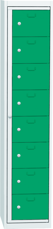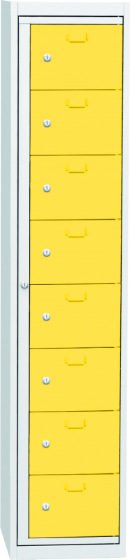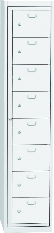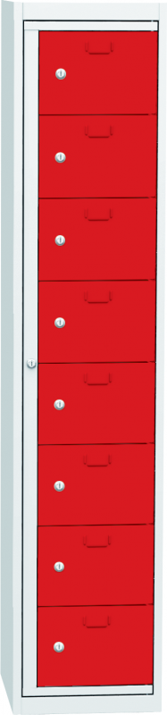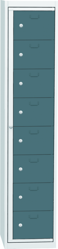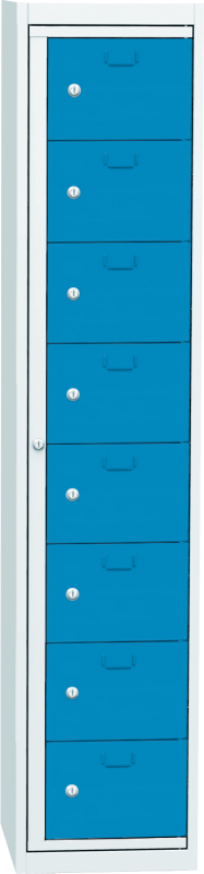 Výdajná skriňa na výmenu pracovných odevov Osem výdajných schránok v centrálnom ráme. Osem výdajných schránok v centrálnom ráme. a rámu je jednobodové, umiestnené uprostred. Zámok je štandardne cylindrický s dvomi kľúčmi, alebo môžu byť dvere a rám vybavené otočným uzáverom pre visiaci zámok (visací zámok nie je súčasťou dodávky). uzamykané zámky s rovnakými kľúčmi. Cylindrický zámok má 2000 kombinácií a umožňuje dodanie hlavného kľúča. Šatníková skriňa je možné vybaviť šikmou strechou, tá zabraňuje odkladaniu odpadkov na strechu skrine a uľahčuje jej čistenie. Uzamykateľné schránky môžu mať miesto prelisu na papierovú menovku, plastový štítok.